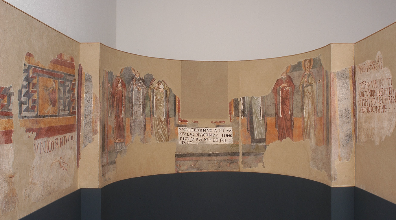 Nell’abside in fondo alla navata sinistra, sotto la finestra a monofora, l’iscrizione porta il nome del committente: Gualteramo. L’altare era dedicato alla Madonna e ai soggetti dipinti collegati al tema della verginità: l’unicorno e le figure delle sante vergini, tra cui Liberata e Faustina. Meno chiaro è il significato del suonatore di doppio flauto, in uso nel mondo antico.