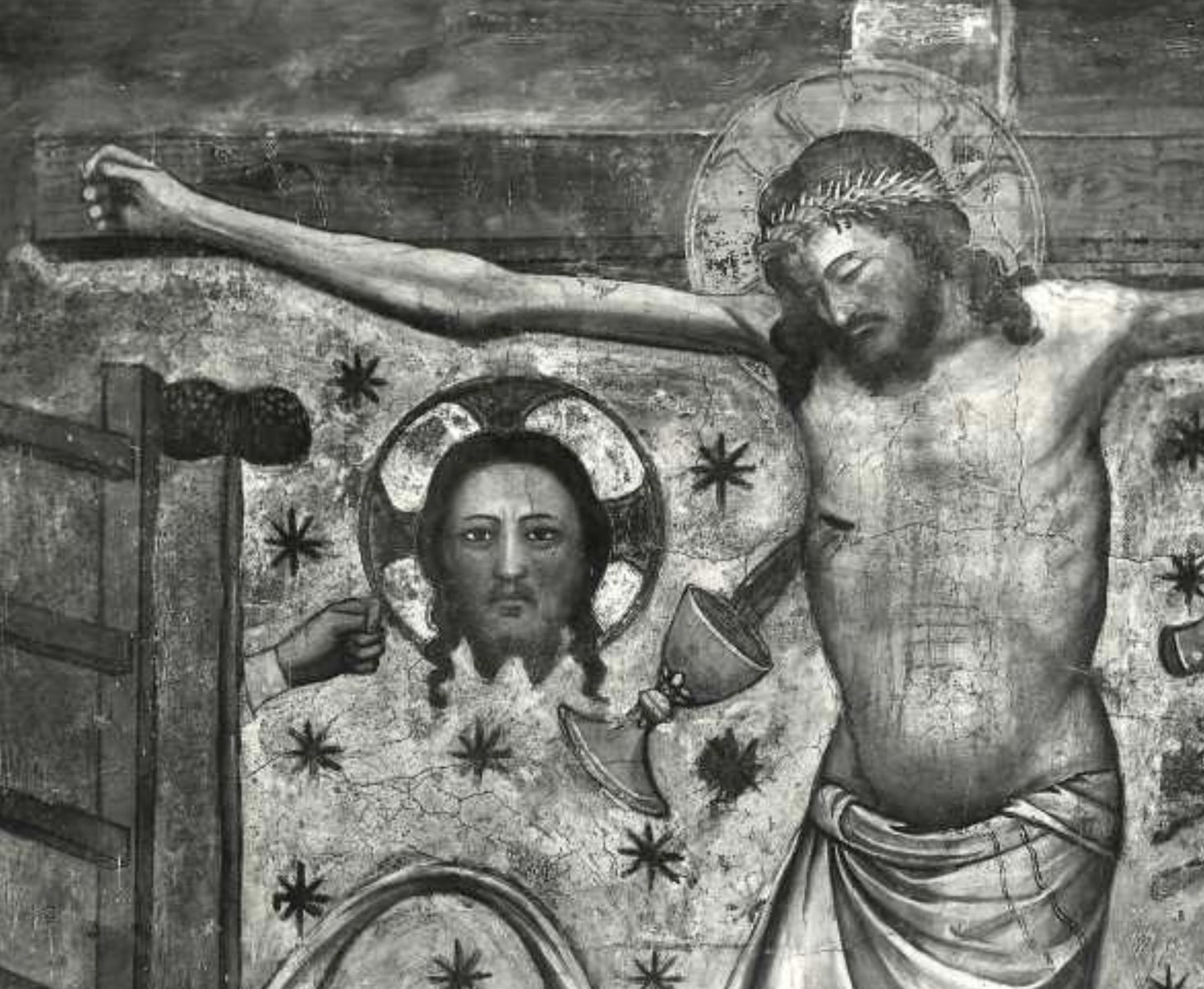 Bonaccorso di Cino, Crocifissione con i simboli della Passione e Santa Maddalena, affresco, 1350 ca., pieve di Grignano, Prato, Italia. Oratorio del Pellegrino, Cappella della Misericordia, Prato.