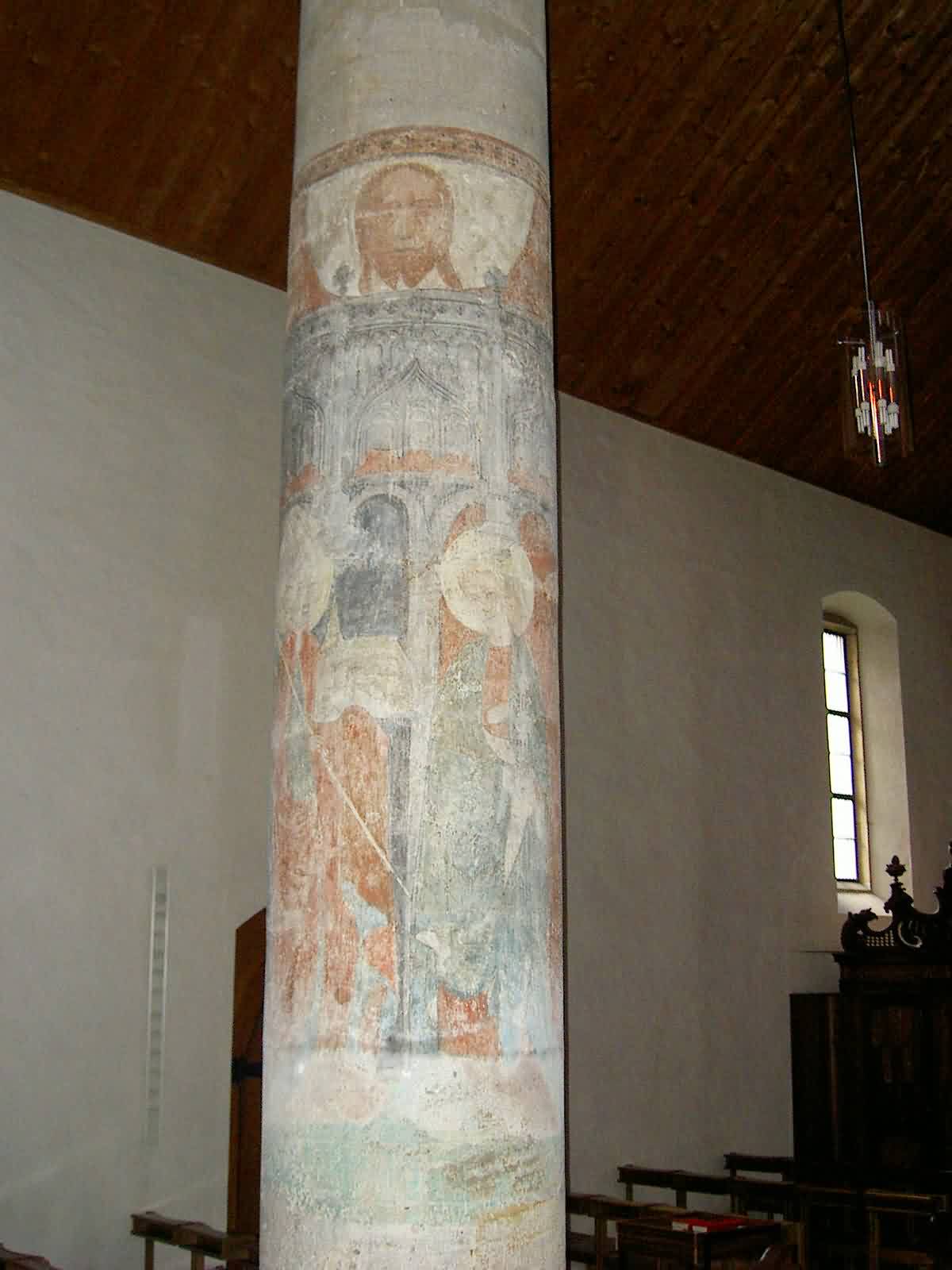 La parte più antica è la volta del coro. Qui la Veronica, rappresentata sulla chiave di volta, è simbolo di Cristo chiave di volta e sostegno di tutto l’edificio. Attorno alla chiave è raffigurato il Tetramorfo e il cielo stellato con il sole e la luna, simboli della duplice natura di Gesù Cristo: il sole, la sua divinità, e la luna – che cala e cresce – la sua umanità. Sulla parete sud del coro, il dipinto sopra l’ex nicchia rettangolare del reliquiario, descrive l’arrivo, nel 955, delle reliquie del martire Maurizio, patrono dell’Impero fin dagli inizi del X secolo. Consegna che rese St. Moriz una chiesa di pellegrinaggio. Sulla parete nord del coro si trova uno dei dipinti più tardi, il ricevimento delle stigmate di San Francesco d’Assisi. Gli affreschi della navata comprendono le immagini di nove delle dieci colonne, che sono stati riscoperti nel 1909. Gli affreschi sono datati tra il 1400 e il 1420, tranne il San Cristoforo dell’ultima colonna datato al 1430-1440. Come era consuetudine, le varie immagini votive furono donate da diverse persone e famiglie. Sul pilastro nono è raffigurata santa Barbara con la torre e un santo vescovo (forse San Wolfang o san Bucardo), sopra la torre, volto ai fedeli che entravano nella chiesa, è rappresentato il velo della Veronica.