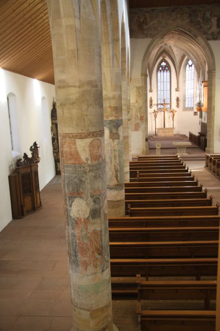 Gli ultimo affreschi sono il grande dipinto a nord dell’arco del coro, scoperto solo nel 1973, con una crocifissione di Cristo con Maria e Giovanni coi santi Maurizio e Caterina d’Alessandria e una seconda crocifissione con Maria e Giovanni sulla parete laterale sinistra.