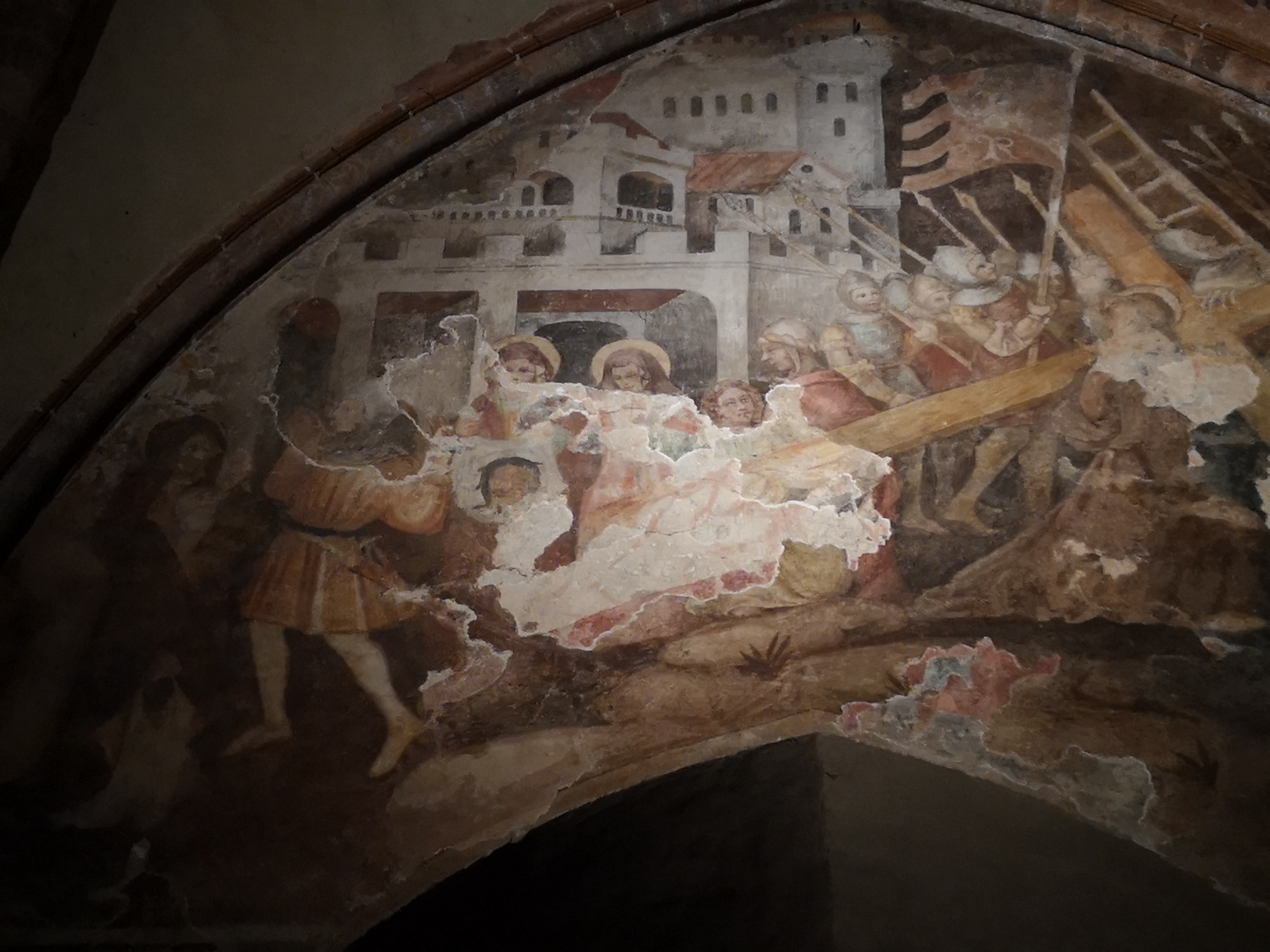 Scuola toscana, Salita al Calvario, affresco, 1400-1420 ca., Collegiata di Santa Maria Assunta, Cappella di Santa Caterina d'Alessandria, Castell'Arquato (Pc), Italia.