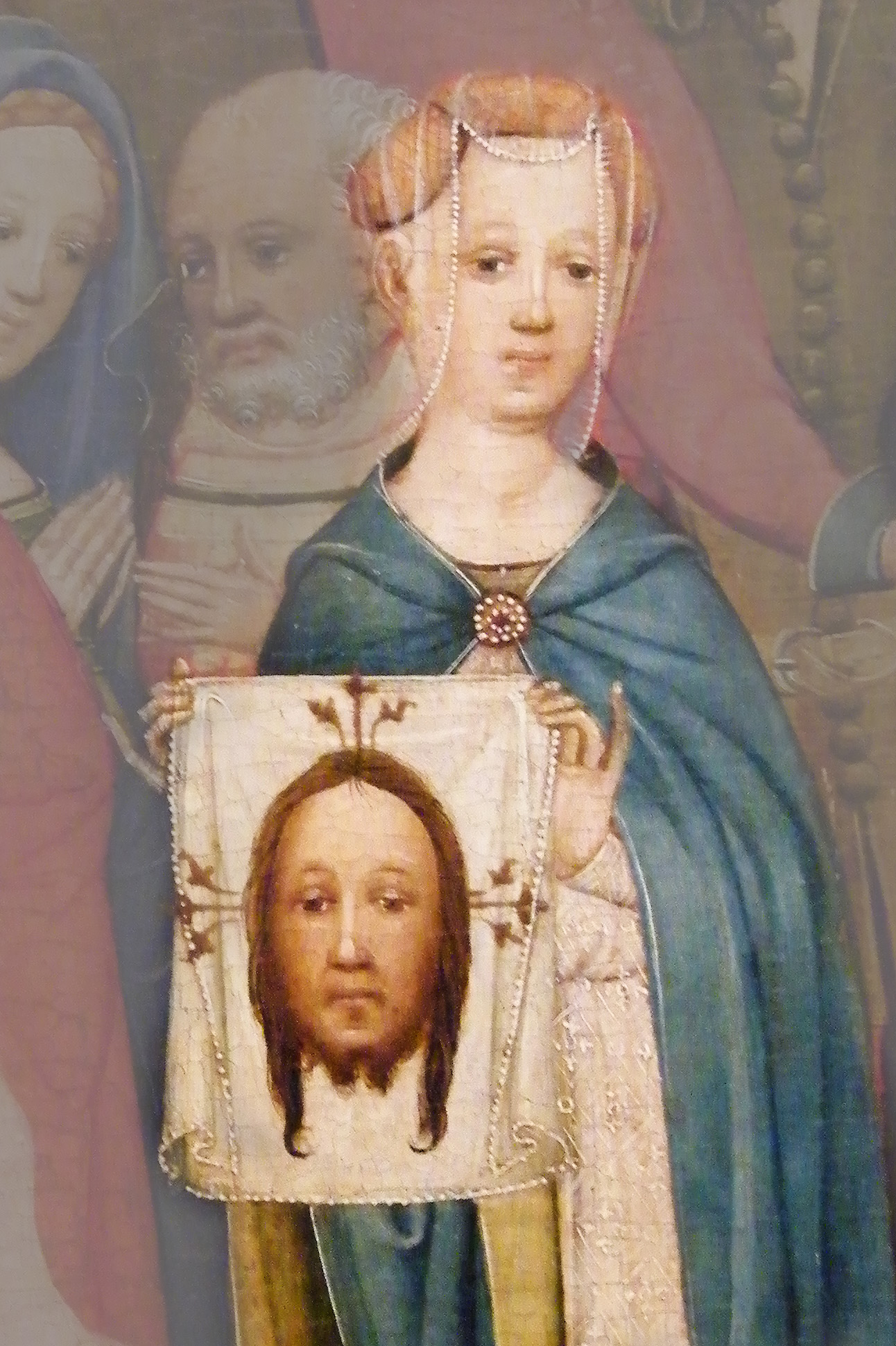 7, barba divisa, croce fiorita, dipinto, occhi aperti, pilgrim way, S.Veronica, salita al Calvario/Calvario, senza corona, trasfigurato, veronica romana