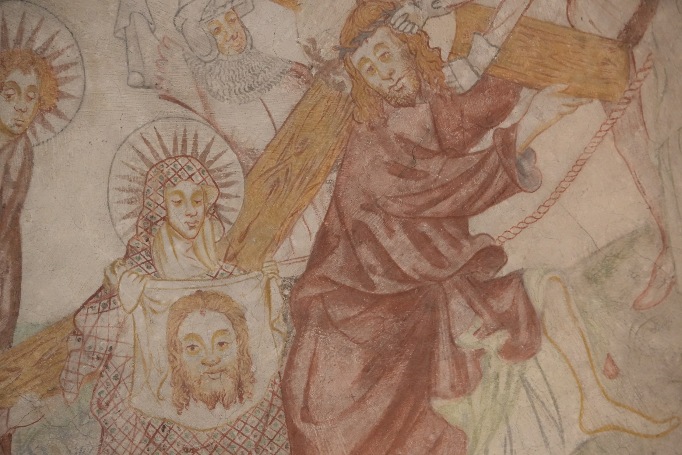 Salita al Calvario e incontro con la Veronica, volta, affresco, 1425, coro, Viskinge Kirke, Viskinge, Danimarca.