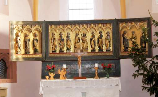 Velo della Veronica tra i volti degli Apostoli, part., predella, tempera su tavola, 1400-1499, altare dell'Incoronazione della Vergine, St. Peter und Paul Kirche, Donndorf, Germania.