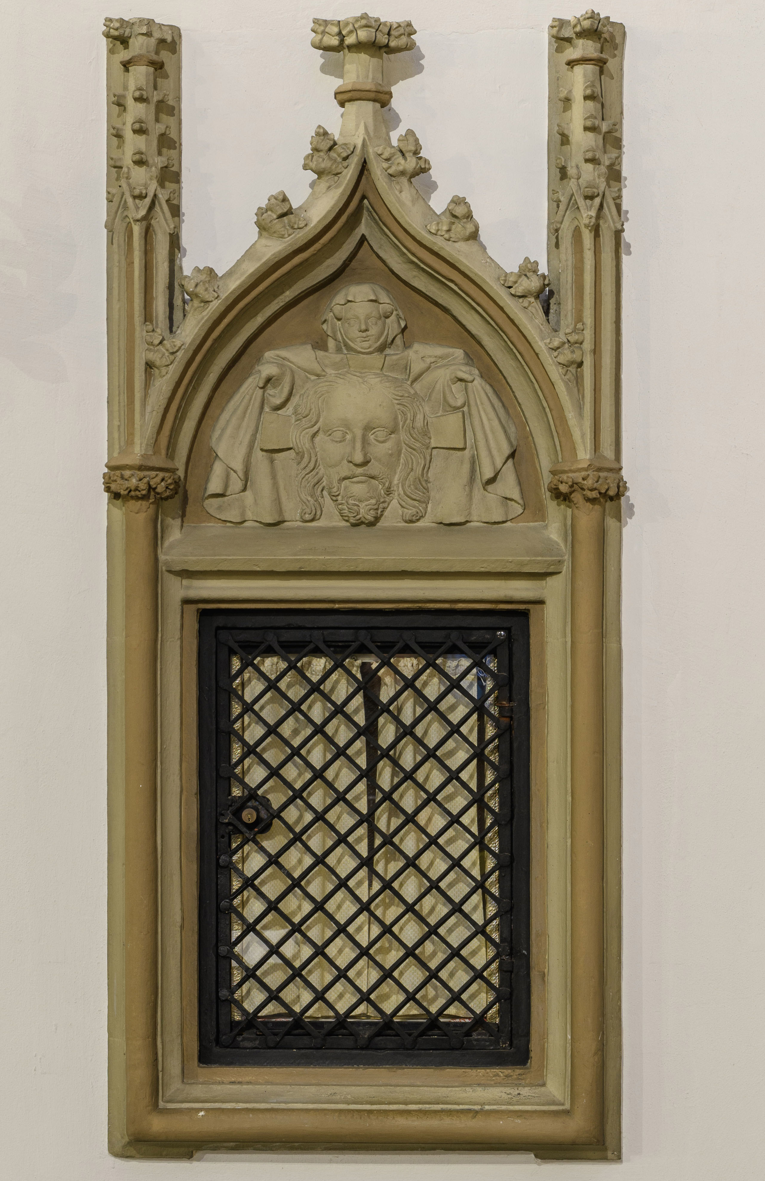 Santa Veronica con il velo, tabernacolo, rilievo in pietra, 1440 ca., Katholische Pfarrkirche, St. Remigius, Unkelbach, Germania.