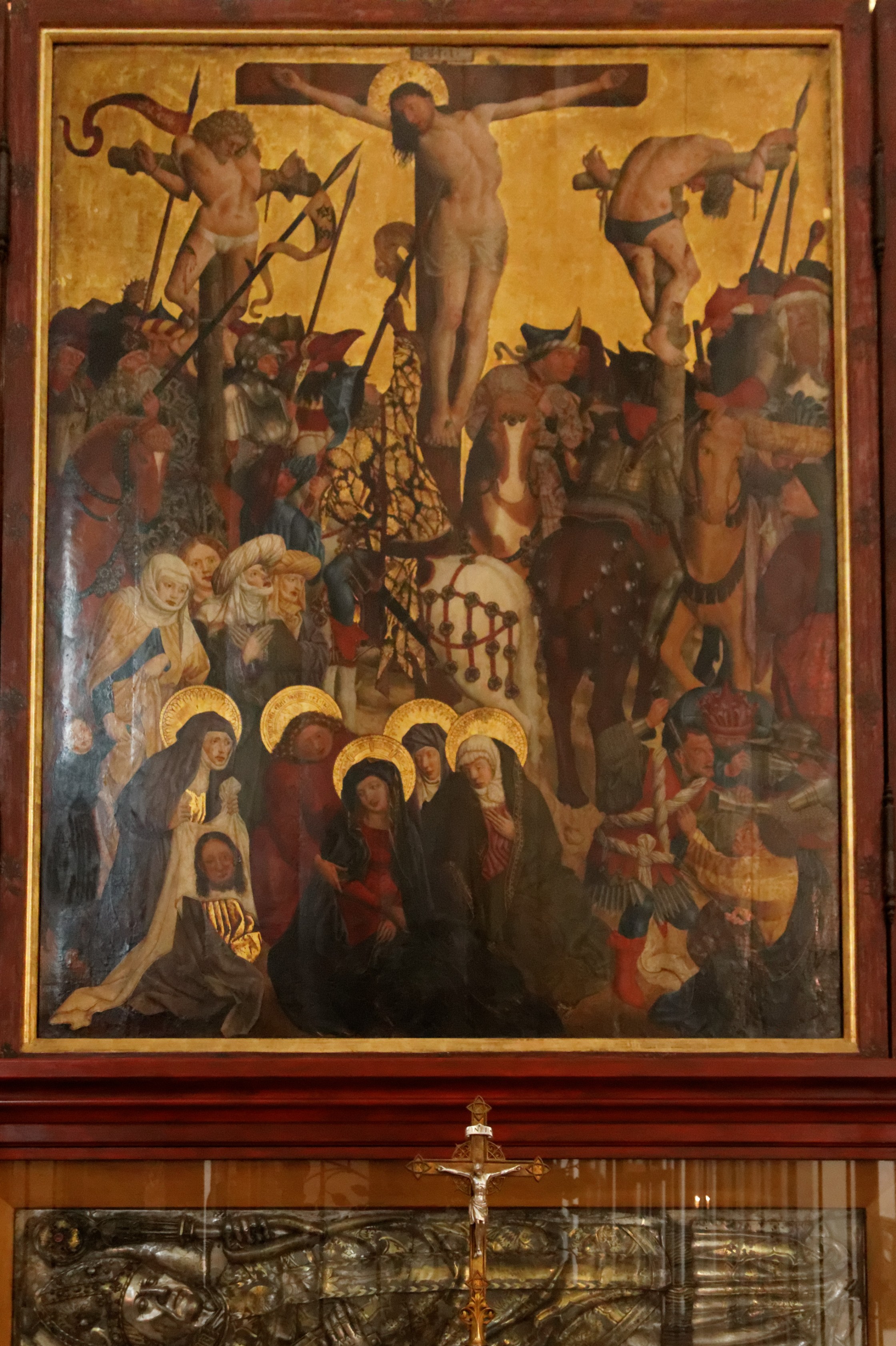 Maestro della Crocifissione del Duomo di Monaco, Crocifissione, olio su tavola, 1440 ca., Marienkapelle, München, Germania. Kapelle Mariä Opferung, Frauenkirche.