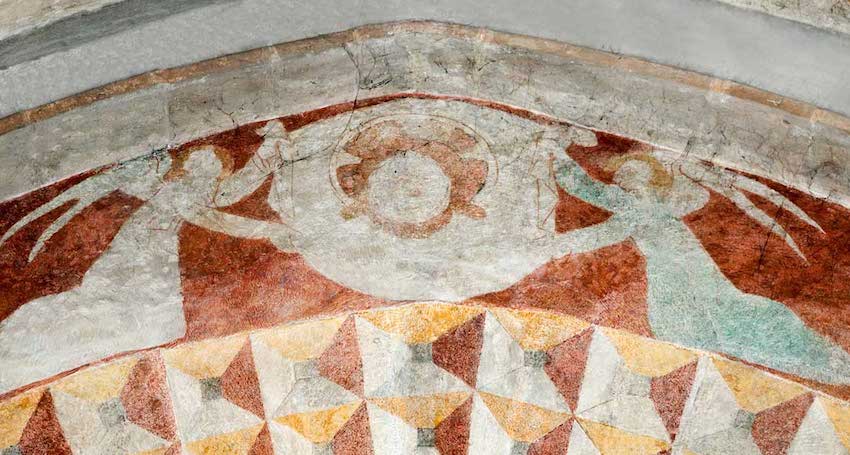 Velo della Veronica sostenuto da angeli, affresco, 1450 ca., coro, Magnuskirche, Altingen, Germania.