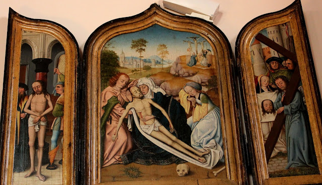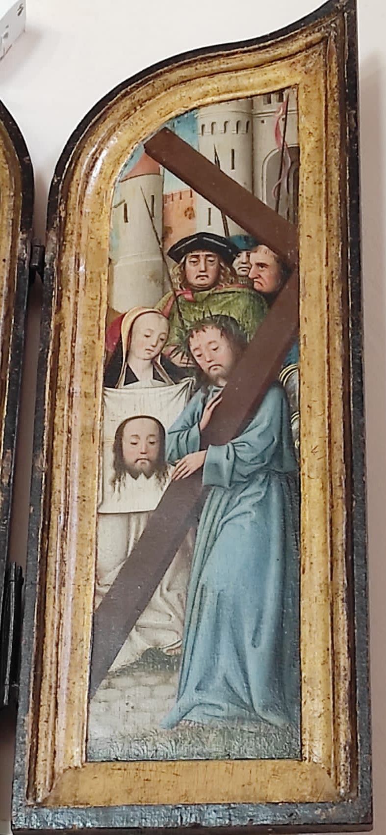 Gesù incontra la Veronica, part., Tríptico de la Pasión, trittico, 1400-1499, Sala Capitular, Claustro de la Catedral, Burgos, Spagna.