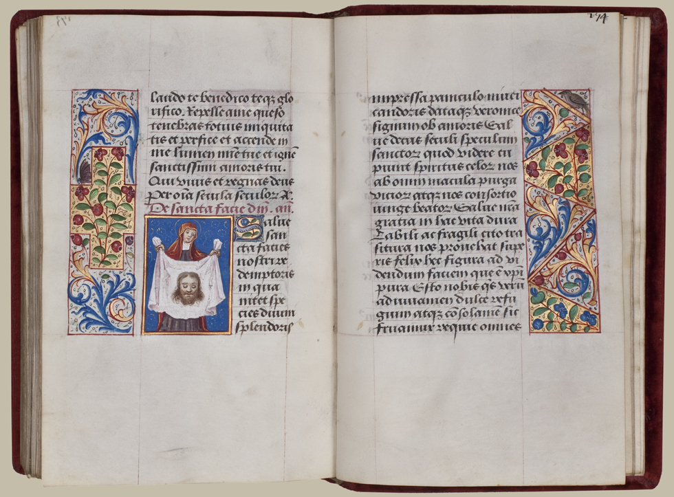 Santa Veronica con il velo, miniatura, Libro d’Ore, ms 46(?), ff. 173v-174r, 1480-1500 ca., Europa. Collezione privata.