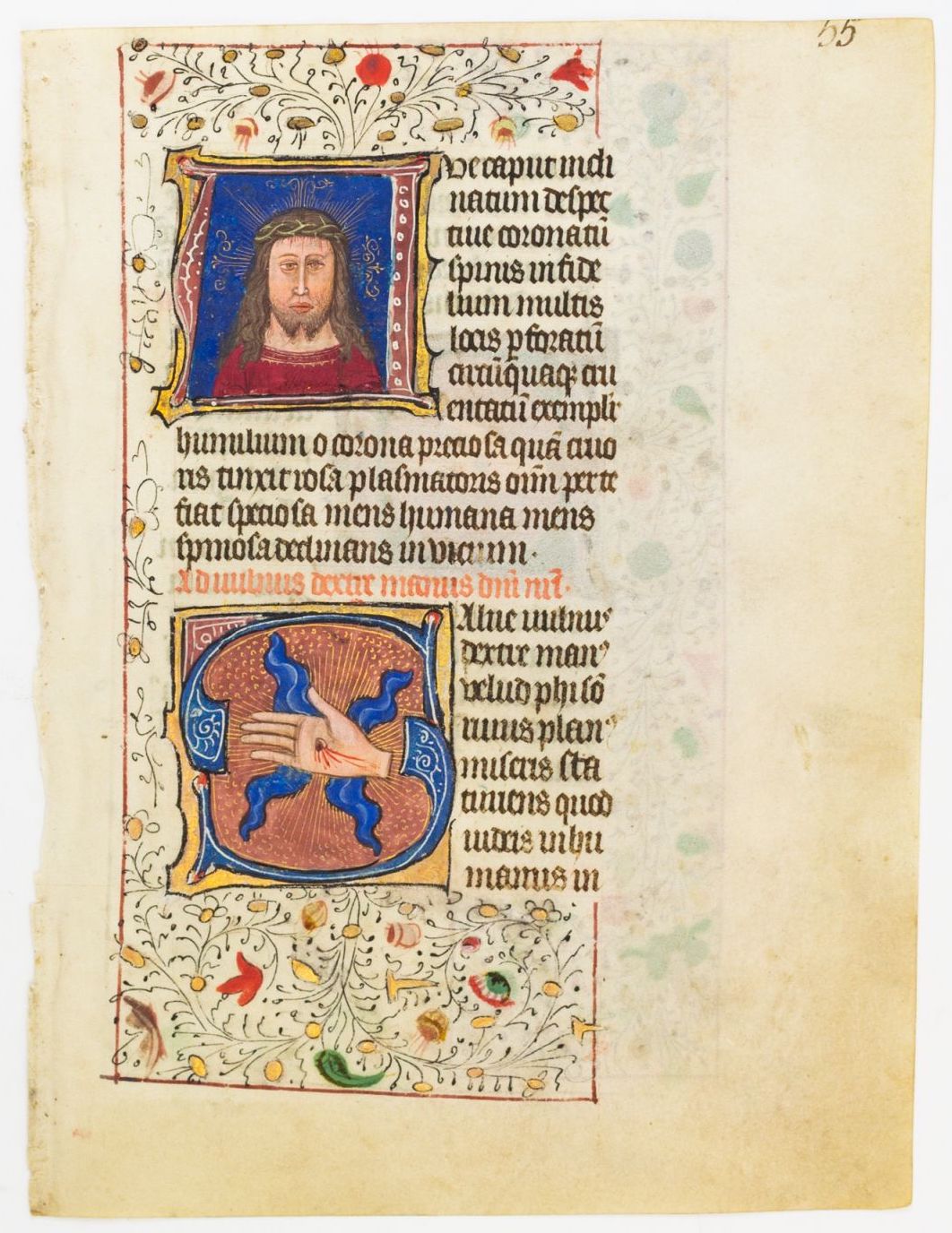 Il foglio staccato apparteneva probabilmente ad un manoscritto prodotto a Bruges per mercato inglese. Sul foglio l’iniziale miniata col Volto Santo è accompagnata dalla piaga della mano di Cristo. Un foglio analogo presenta poi altre tre iniziali che mostrano la piaga sul costato e le piaghe del piede sinistro e destro.