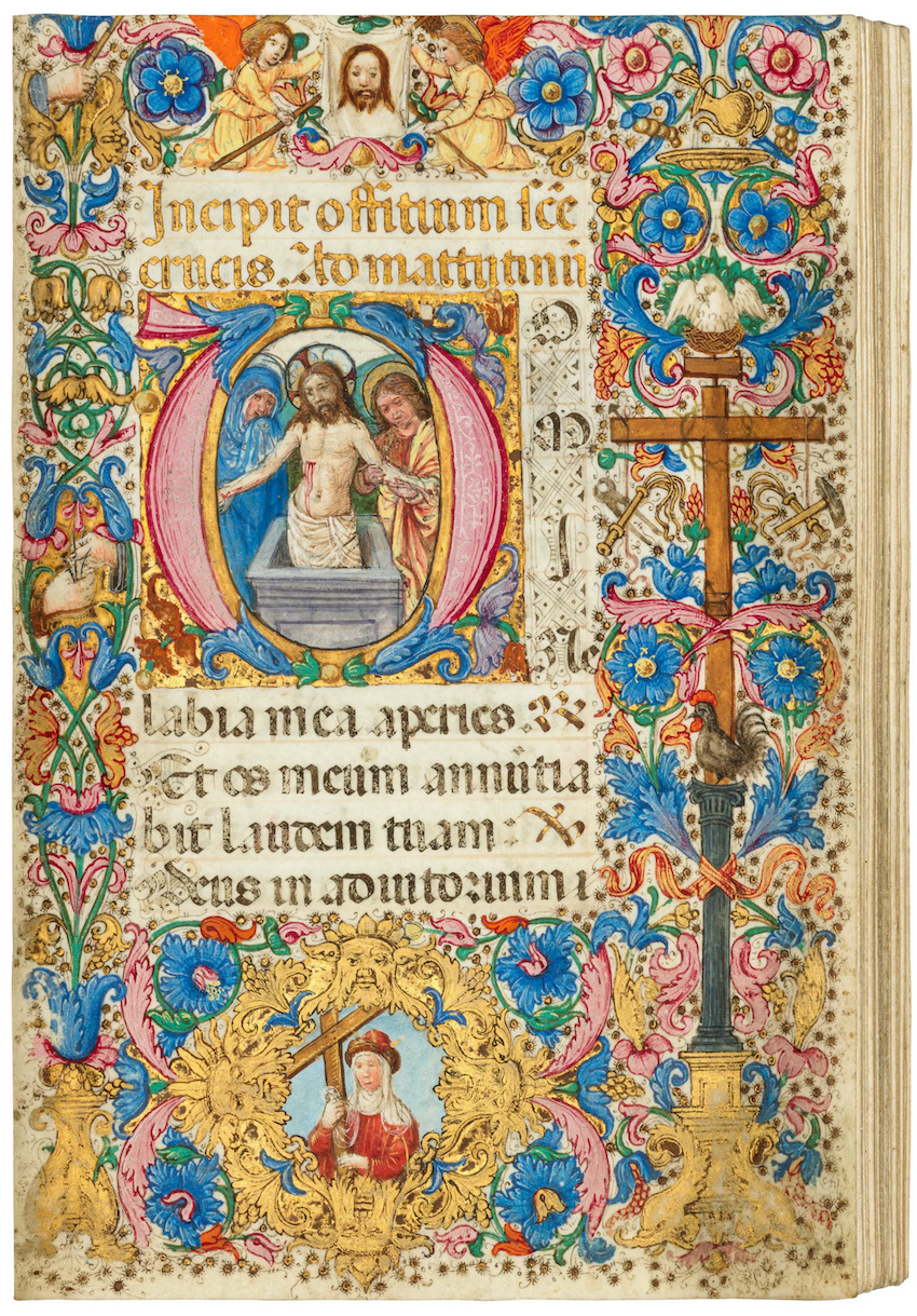 Si tratta dell’Incipit offitium Sancte Crucis. L’iniziale miniata a centro pagina, Incipit offitium Sancte Crucis raffigura un Ecce Homo, mentre tutto intorno i simboli della Passione.