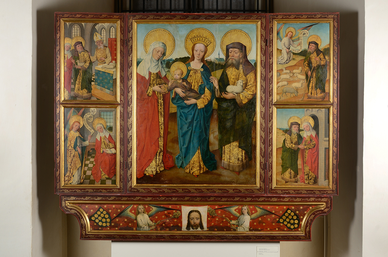La pala dedicata ad Anna e Gioacchino, proviene dalla chiesa di Gadebusch vicino a Lübeck. Sia lo stemma della famiglia Bülow che il programma di immagini della pala d’altare indicano che fu commissionata dalla famiglia per la cappella dedicata a sant’Anna. È l’unica pala, realizzata dalla bottega di Hermen Rode che presenti un dipinto sulla tavola centrale.