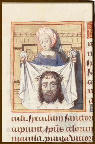 Santa Veronica con il velo, miniatura, Libro d’Ore (uso di Roma), ms 76 F 14, f. 213r, 1490-1500, Parigi?, Francia. Koninklijke Bibliotheek, Den Haag.