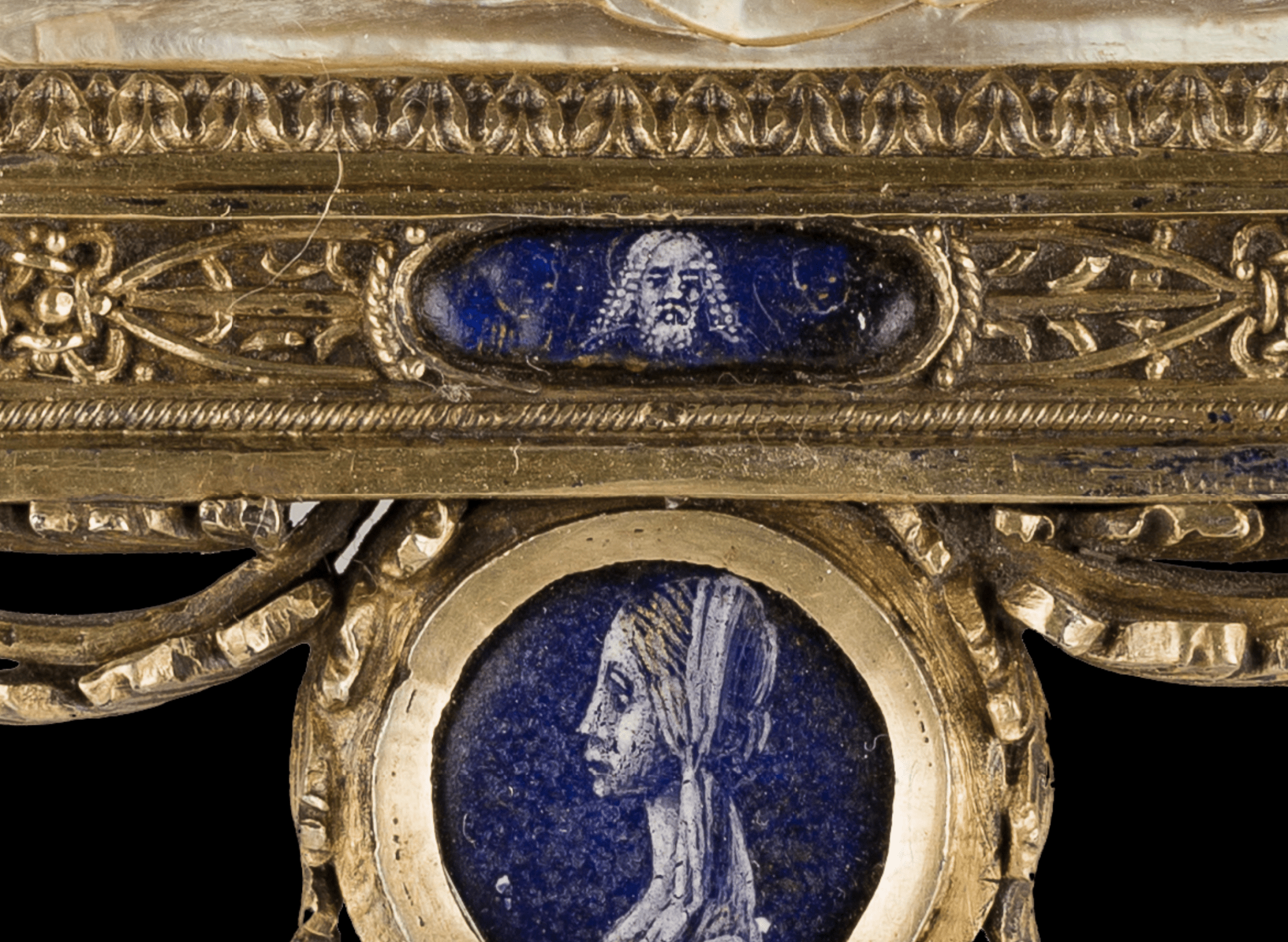 Orafo lombardo, Velo della Veronica, part., cornice, oggetto devozionale, argento dorato, smalto e madreperla, 1499 ca., Milano, Italia. targa pendente con Pietà e Resurrezione, Museo Poldi Pezzoli, Milano.