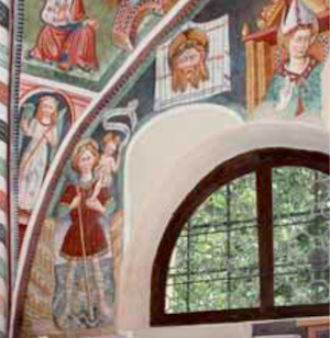 Il velo della Veronica è rappresentato sulla parete sud dell’abside, a fianco di un vescovo, San Cristoforo e San Bernardo di Chiaravalle.