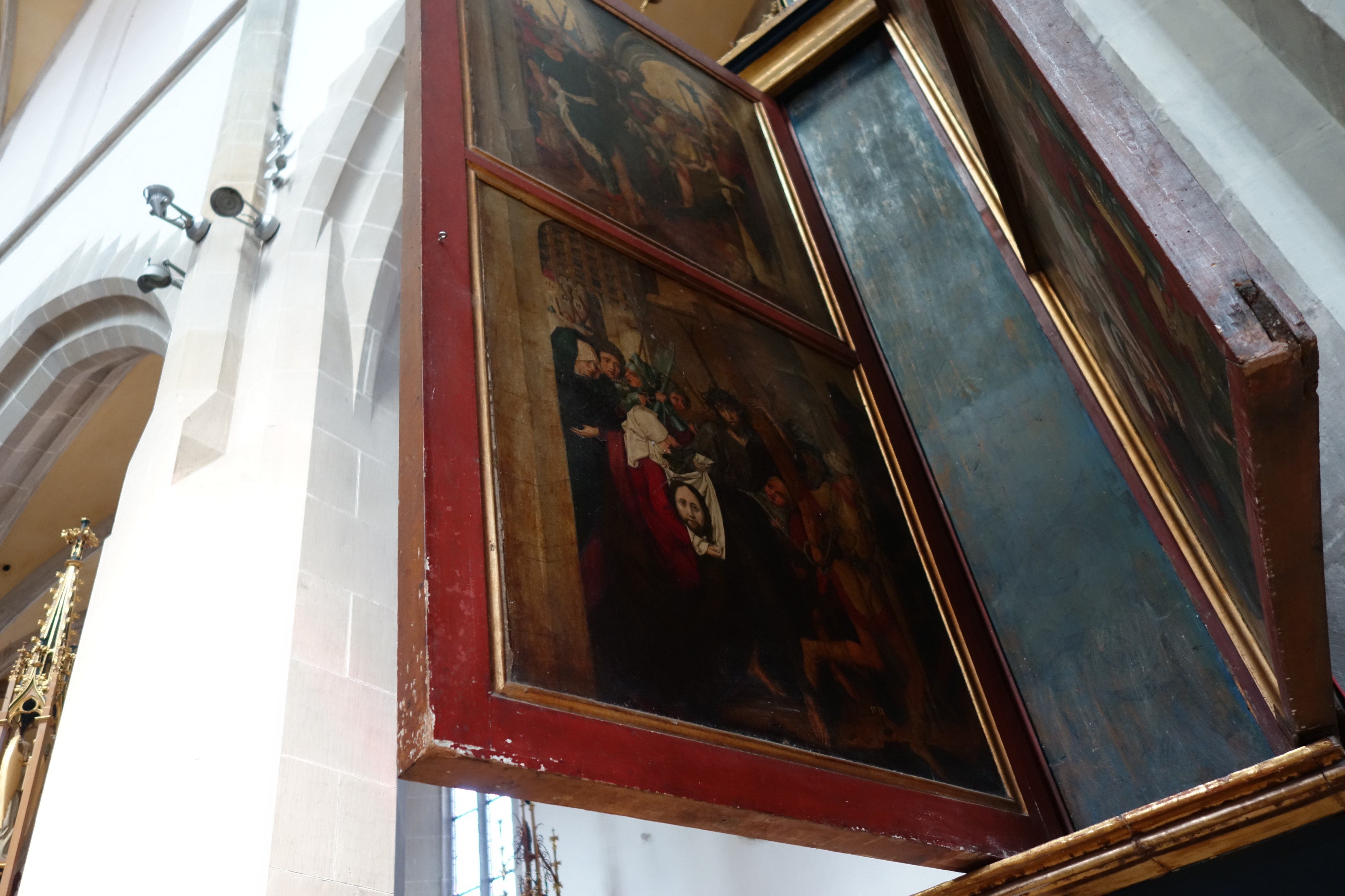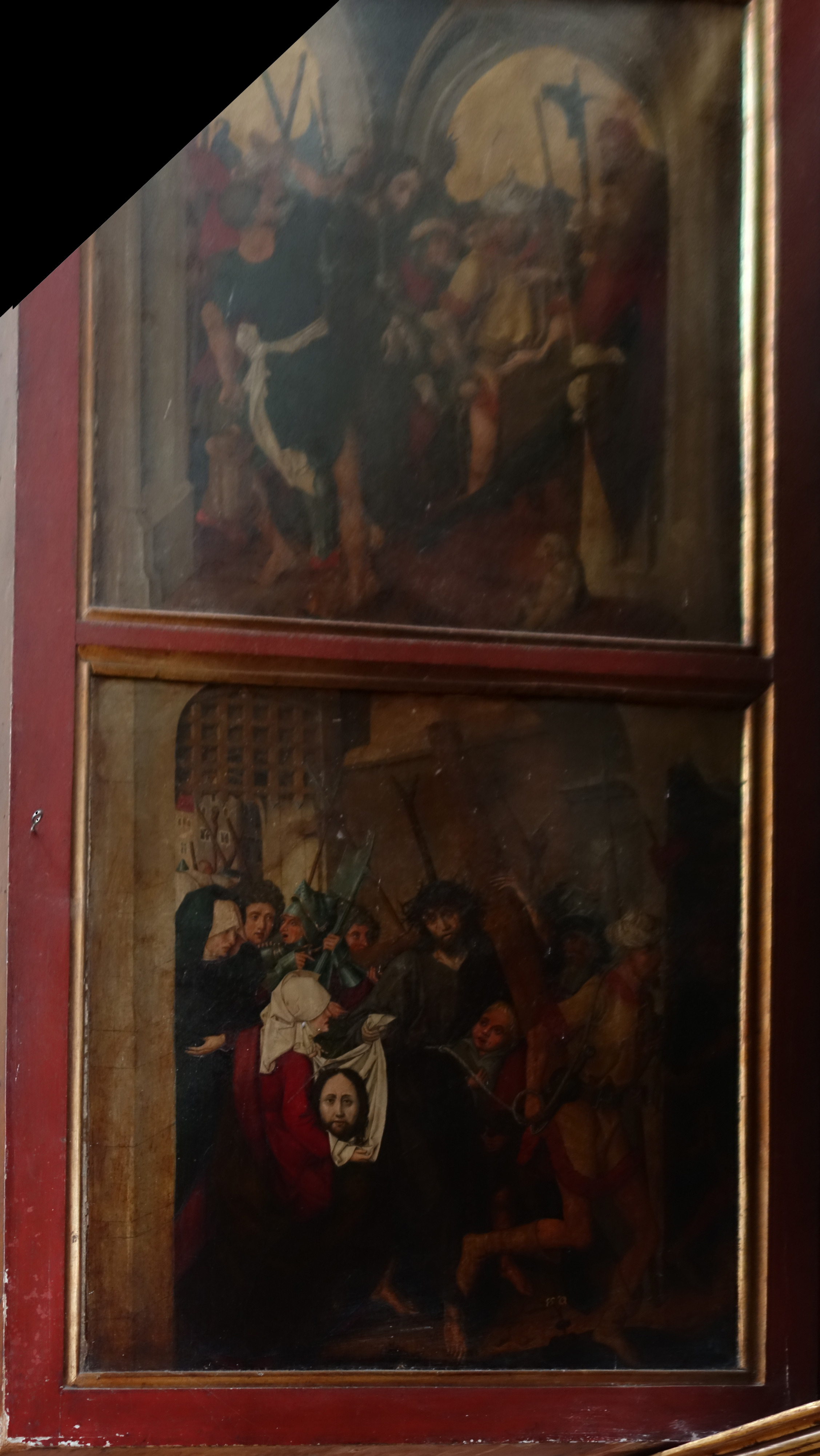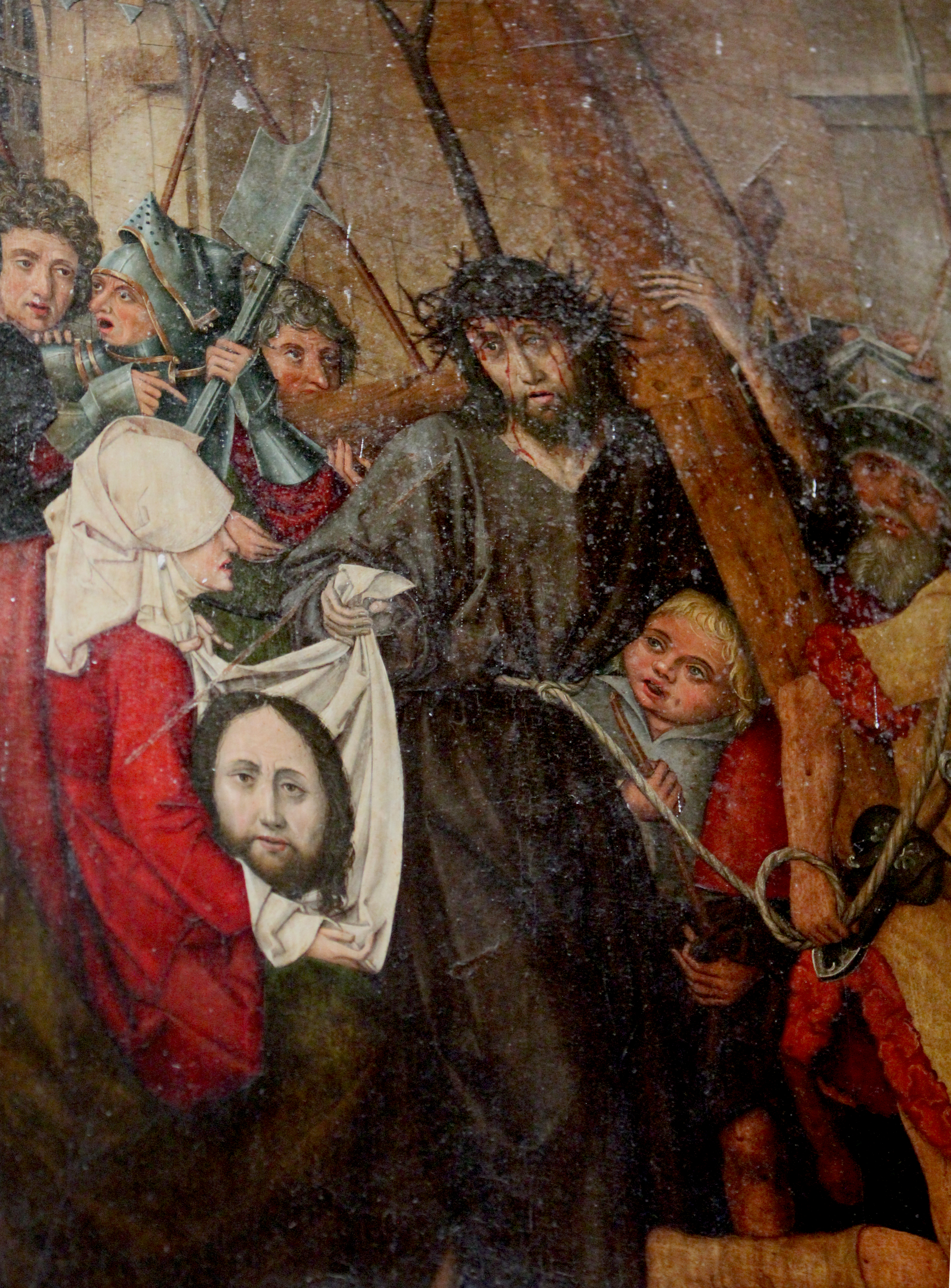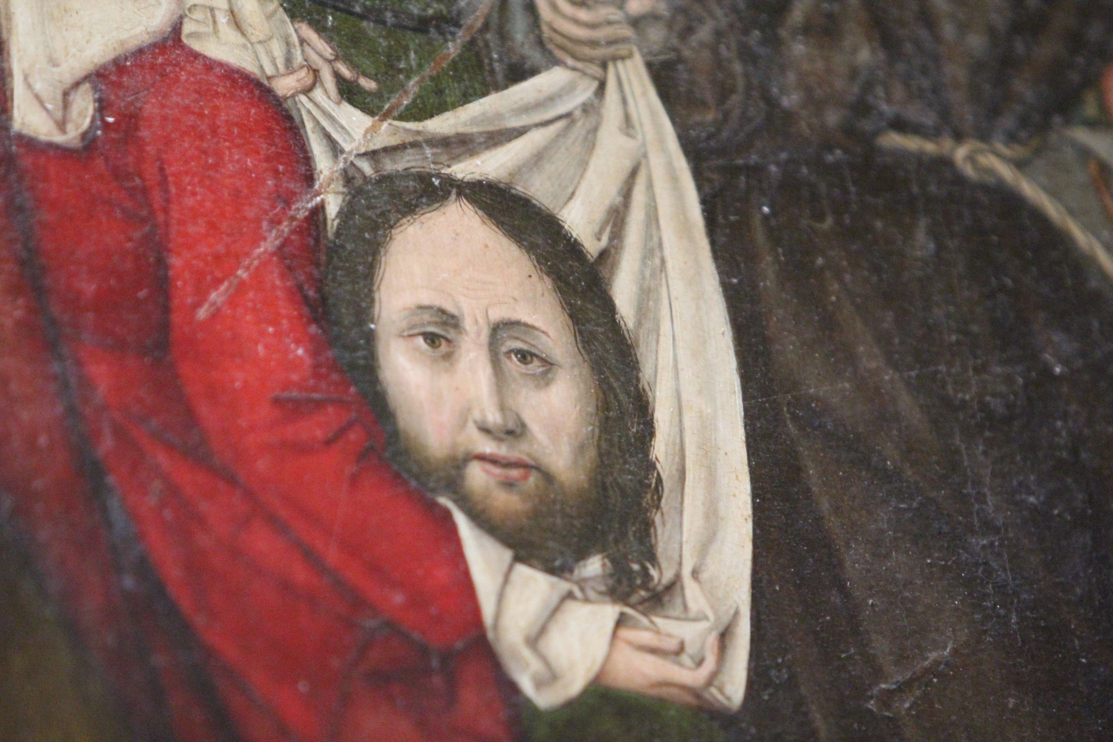 Veronica riceve il velo da Cristo, part., Anbetungsaltar, pala d'altare, pannello laterale esterno, tempera su tavola, 1500, Bazilika svätého EgÃdia, Bardejov, Slovacchia.