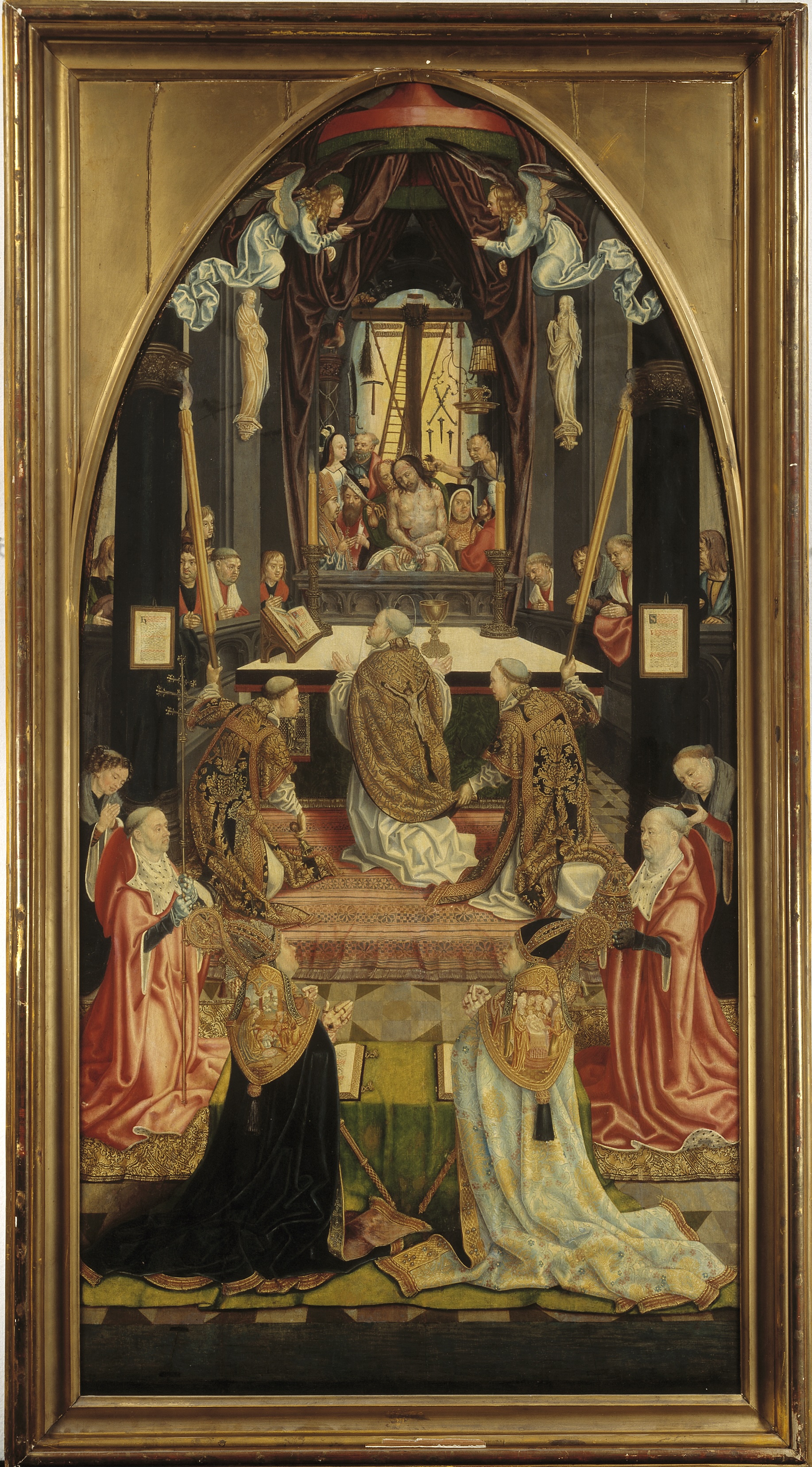 Master of the Aachen Altar, Piviale con Velo della Veronica, part., Messa di San Gregorio, paramento liturgico dipinto, olio su tavola, 1495-1504, Köln, Germania. Museum Catharijneconvent, Utrecht.