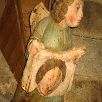 Velo della Veronica sostenuto da un angelo, peduccio, scultura in legno policroma, 1480-1520, église Notre-Dame de la Merci, Trémel, Francia.