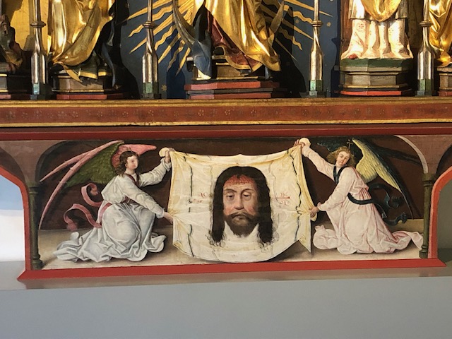 Meister des Meckfelder Altar, Velo della Veronica sostenuto da angeli, predella, tempera su tavola, 1505, Kleiner Marienaltar, Pfarrkirche in Obernitz, Obernitz, Germania. Stadtmuseum im Franziskanerkloster, Obernitz in Saalfeld/Saale.