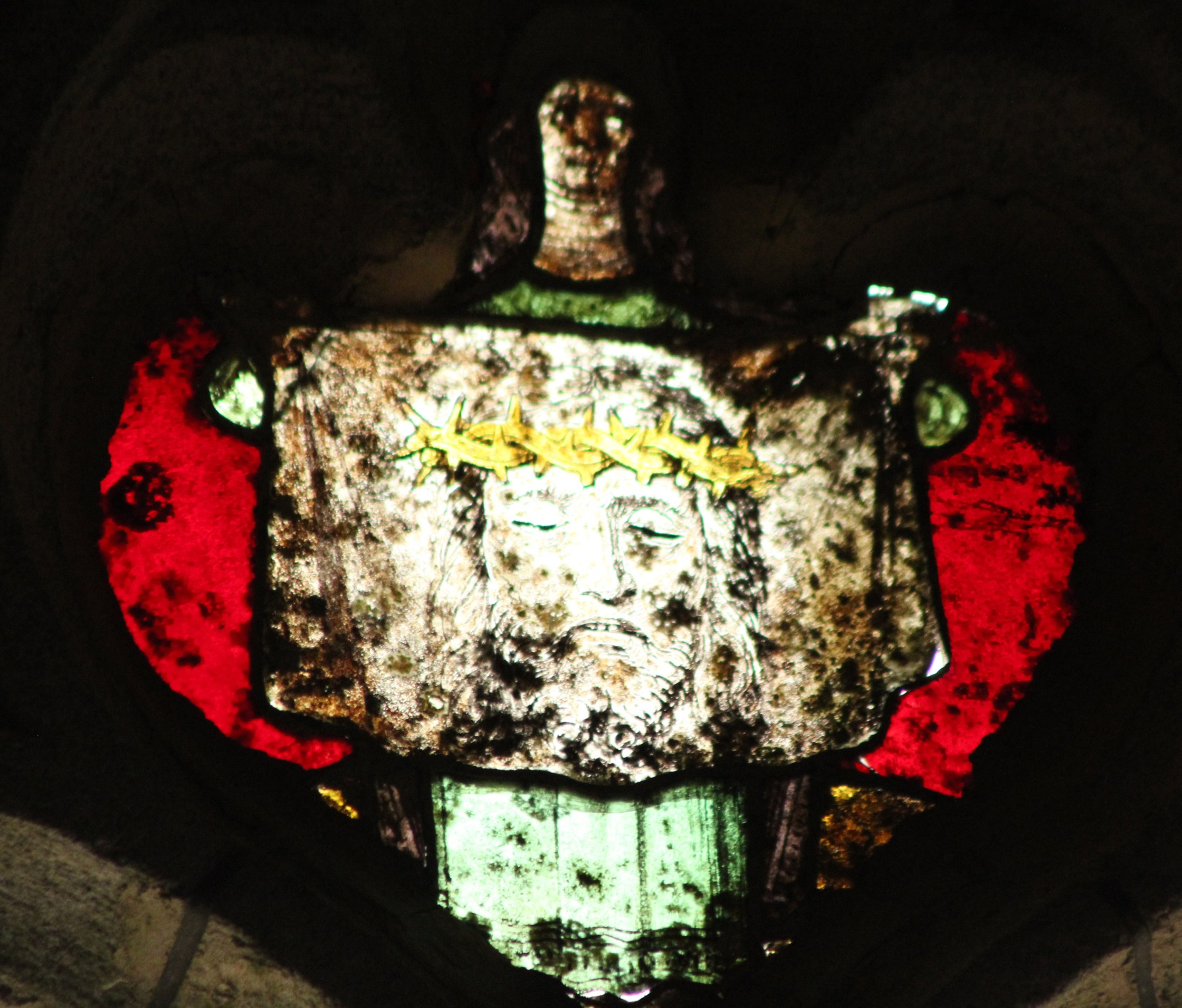 Santa Veronica con il velo, vetrata, 1500-1525, finestra 5, Eglise paroissiale Saint Fiacre, Guengat, Francia.