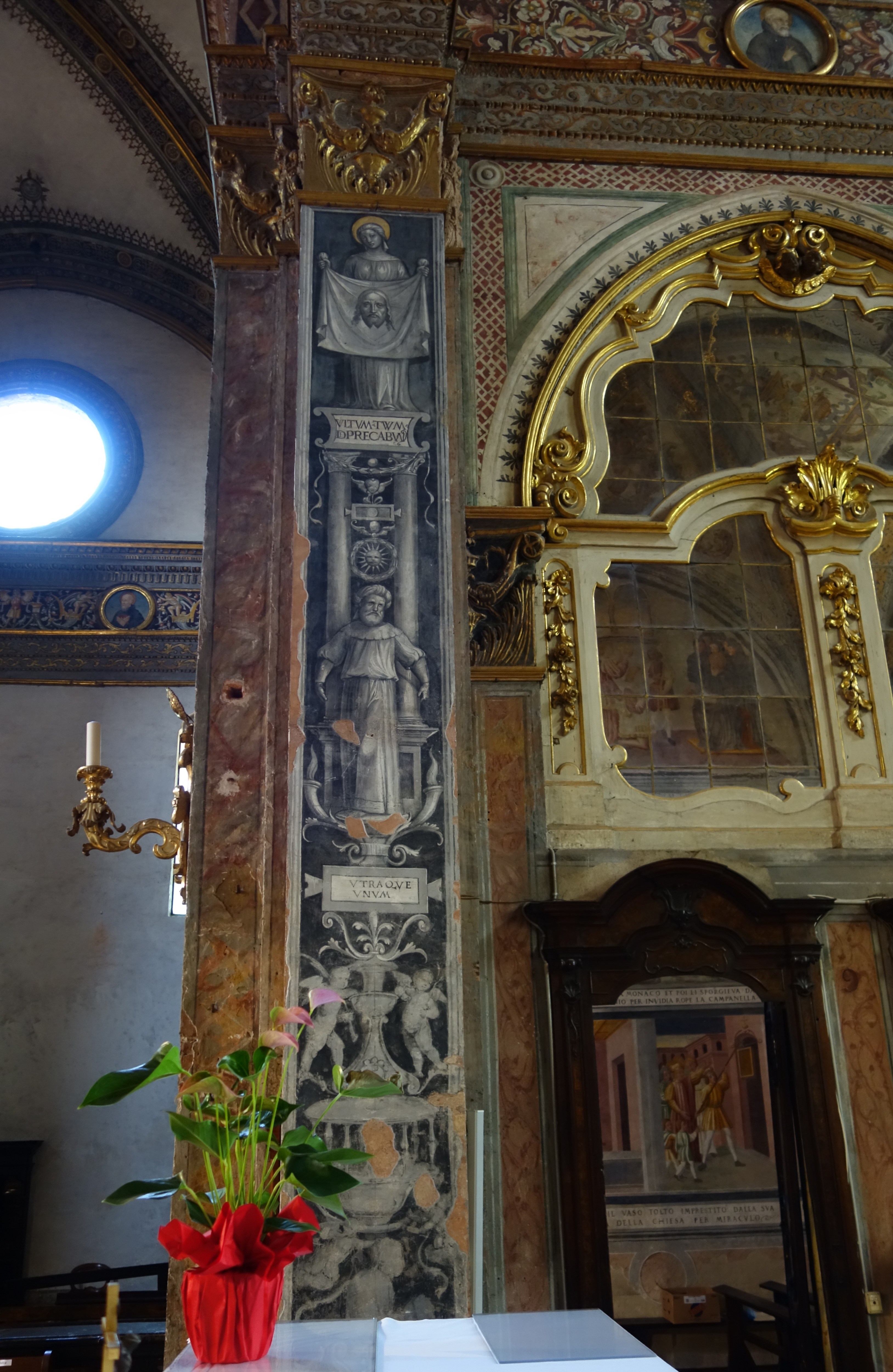 Bernardino Lanzani, Santa Veronica con il velo e figura di profeta, affresco, monocromo su toni di grigio, 1500-1510, pilastro presbiterio, basilica del Santissimo Salvatore, Pavia (Pv), Italia.