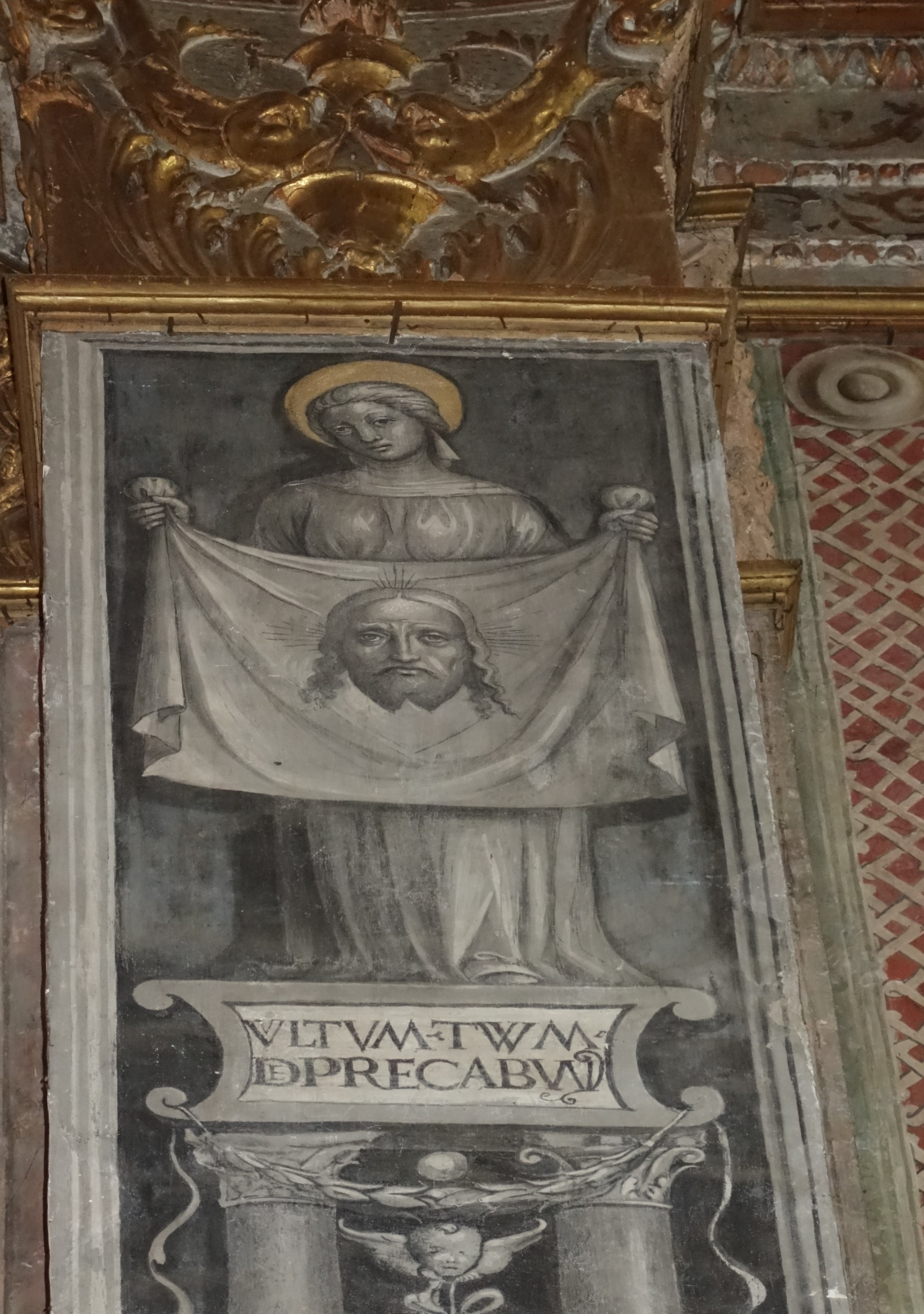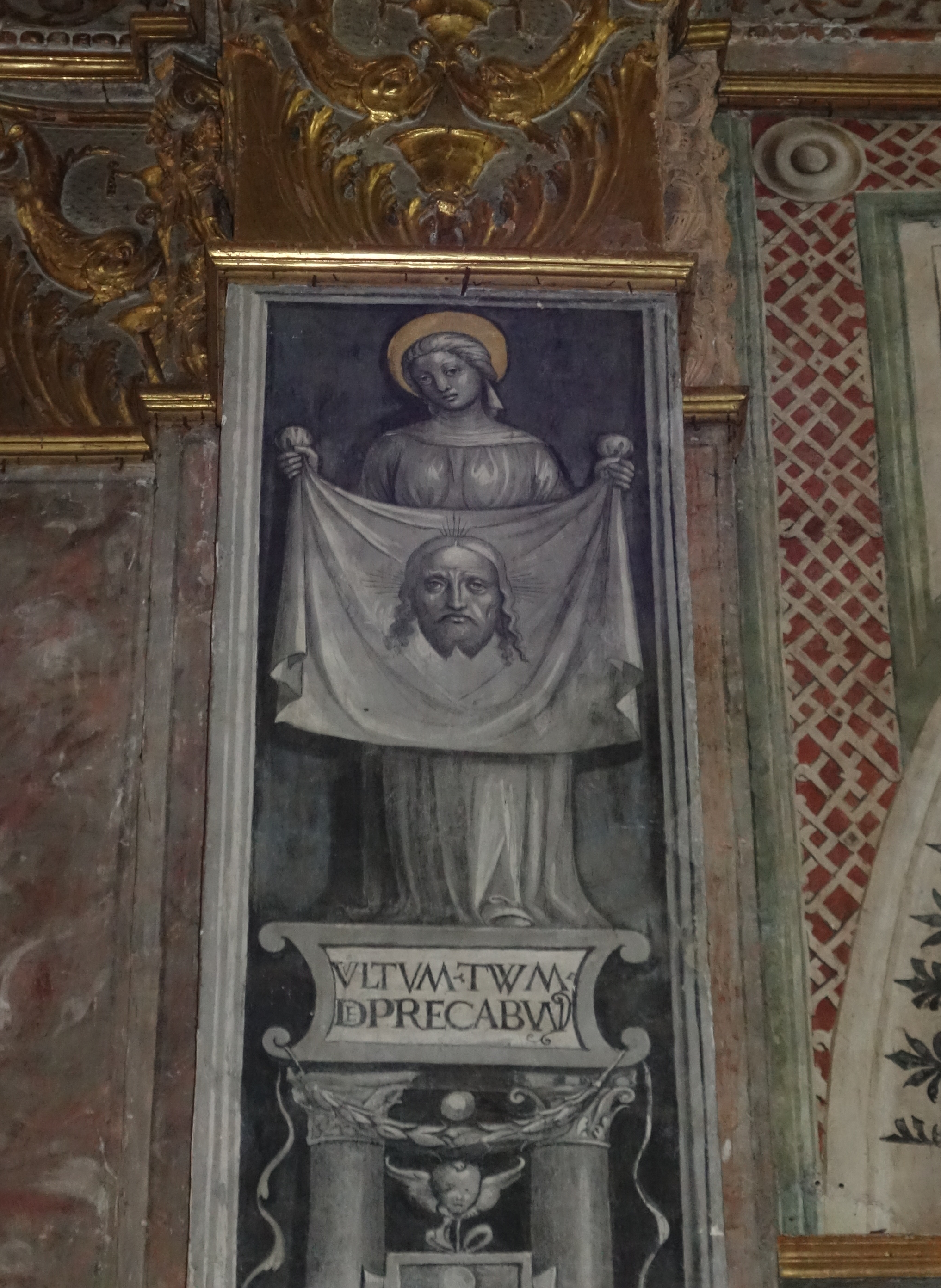 Santa Veronica è raffigurata in alto, più sotto, davanti ad un’edicola architravata, una figura maschile, forse un profeta, quindi due angeli accanto ad un vaso e due figure genuflesse. Il testo in latino rieccheggia il salmo 44 versetto 13: “i più ricchi del popolo cercano il tuo volto”.