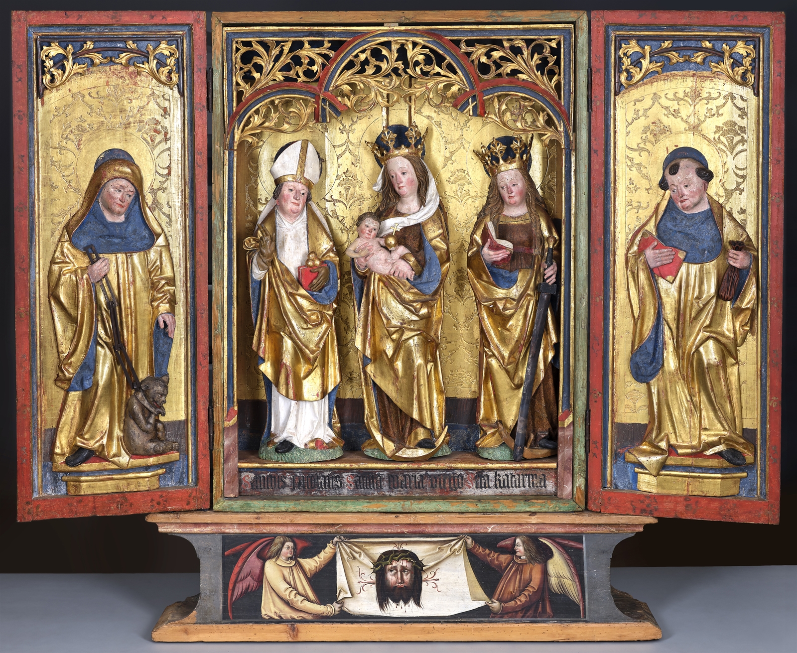 Bottega di Ivo Strigel, Memmingen (Germania meridionale), Altare alato, pala d'altare, rilevo in legno policromo e dorato, 1510, Kapelle San Nicolao, Grono, Svizzera. Rätisches Museum.