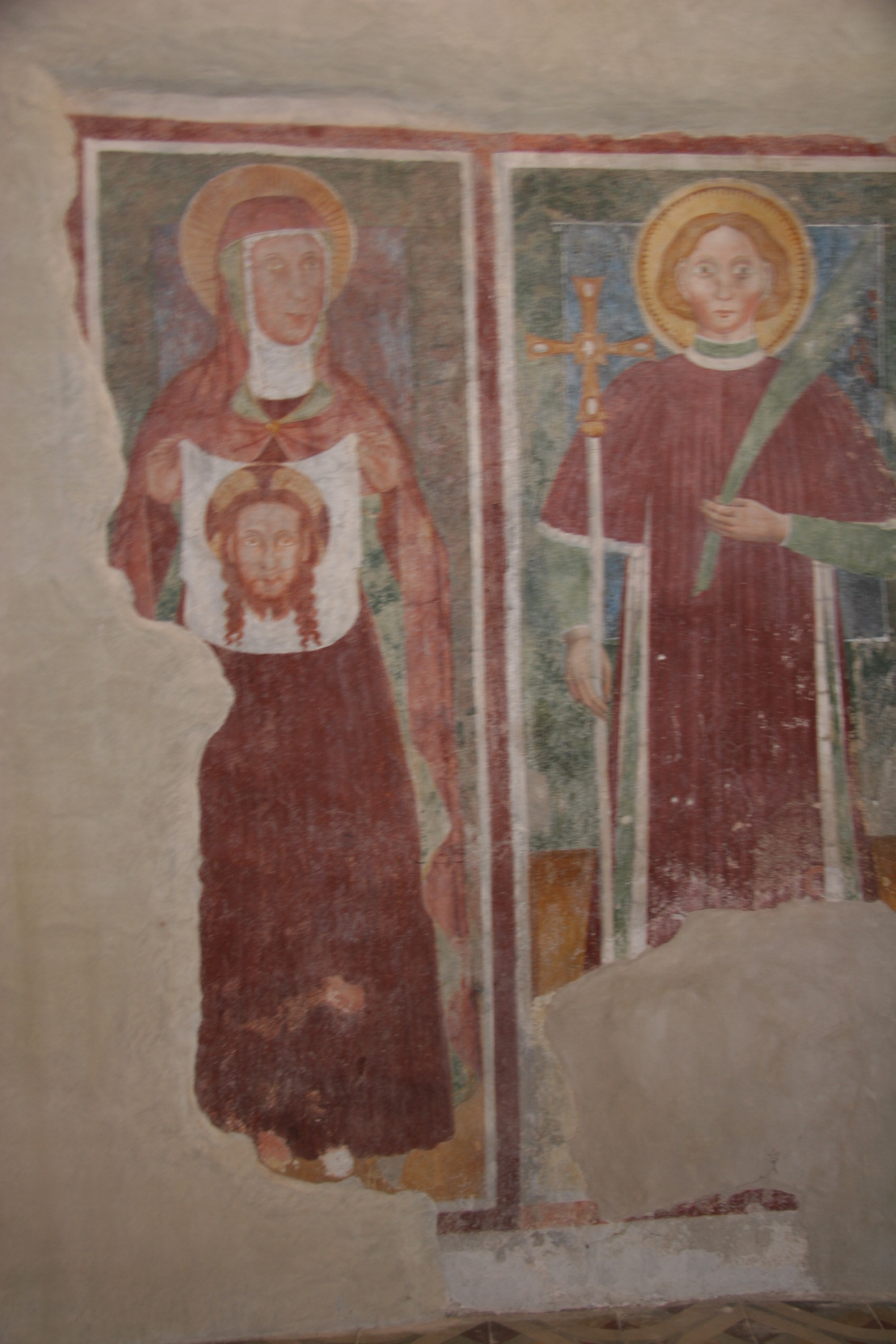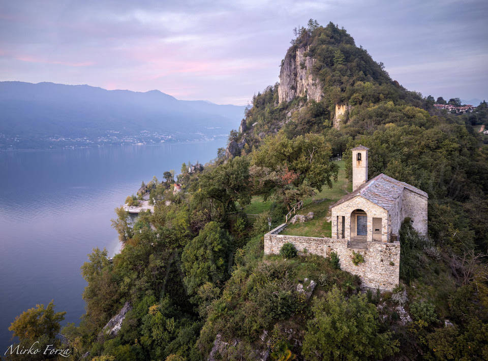 La chiesa di Santa Veronica, una delle rare chiese dedicata alla santa, si eleva sullo spalto della rocca di Caldè, un impervio promontorio incuneato nelle acque del lago Maggiore che, almeno dal X sec., fu convertito quasi interamente in presidio militare dipendente dall’arcivescovo di Milano. Non risulta, tuttavia, che la chiesetta sia mai stata inclusa nel perimetro di tale, imponente fortilizio; forse, come denuncia il popolare toponimo, l’edificio sacro ebbe qualche relazione con il complesso sistema estrattivo che avveniva ai piedi della medesima rocca, verso il lago, dove veniva estratta una pregiata calce utilizzata anche per la fabbrica del Duomo di Milano. Nella chiesa un ciclo affrescato quattrocentesco rappresenta il solo termine ante quem a disposizione per la datazione dell’edificio. Il velo della veronica affrescato sul fronte sotto la mensa insieme agli affreschi dell’abside secondo gli studiosi sono riconducibili ai primi decenni del 1500. Mentre databili al Quattrocento sono le due figure di santi, santa Veronica e un martire non identificato, sulla parete destra del presbiterio.