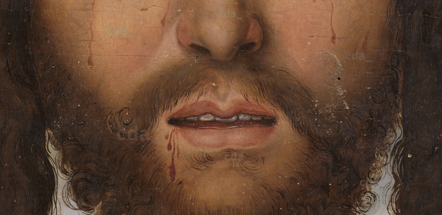 L’opera è stata più volte ridipinta. Ad oggi nelle riproduzioni del CDA la bocca aperta mostra il quinto incisivo centrale (Cfr. Marco Bussagli, Il male in bocca, Medusa 2023).