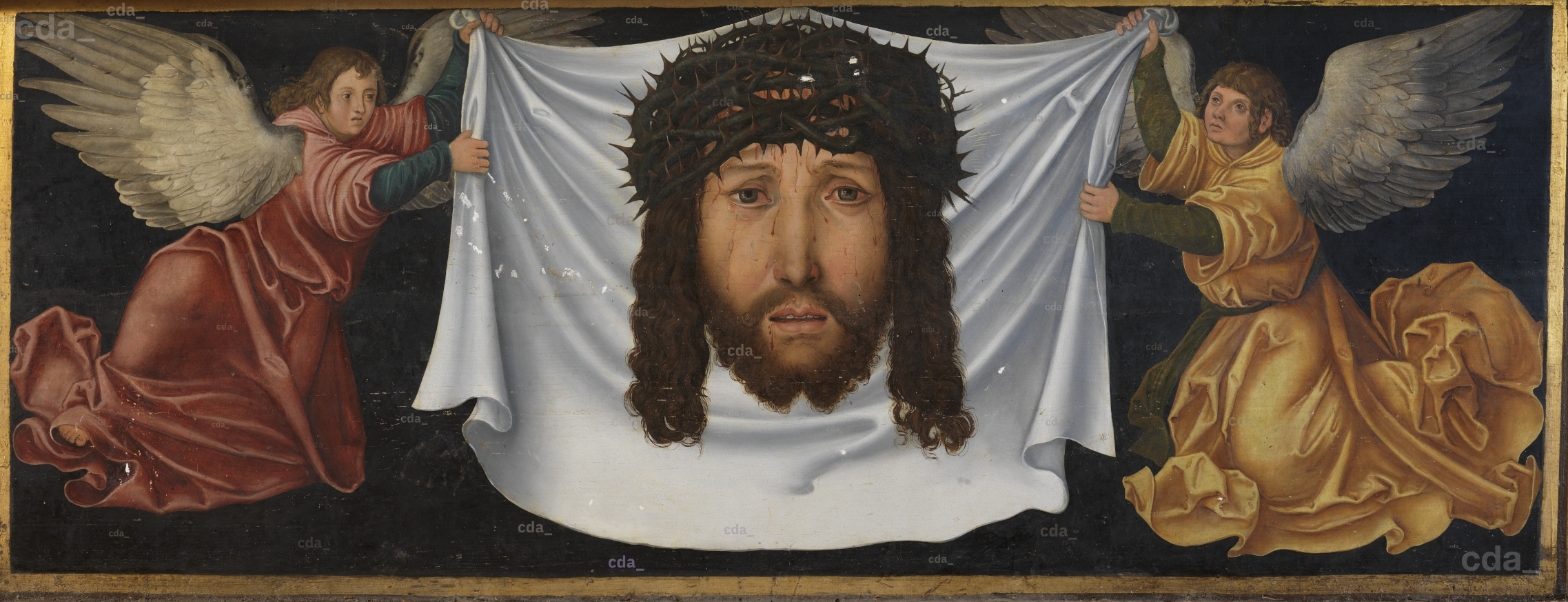 Velo della Veronica sostenuto da angeli, predella, olio su tavola, 1514, chiesa cattolica Domenicana, Berlin, Germania. Evangelische Stadtkirche Sankt Moritz, Mittenwalde.