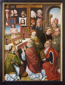 Messa di San Gregorio, olio su tavola, 1520, Bischöfliche Dom- und Diözesanmuseum, Mainz, Germania.