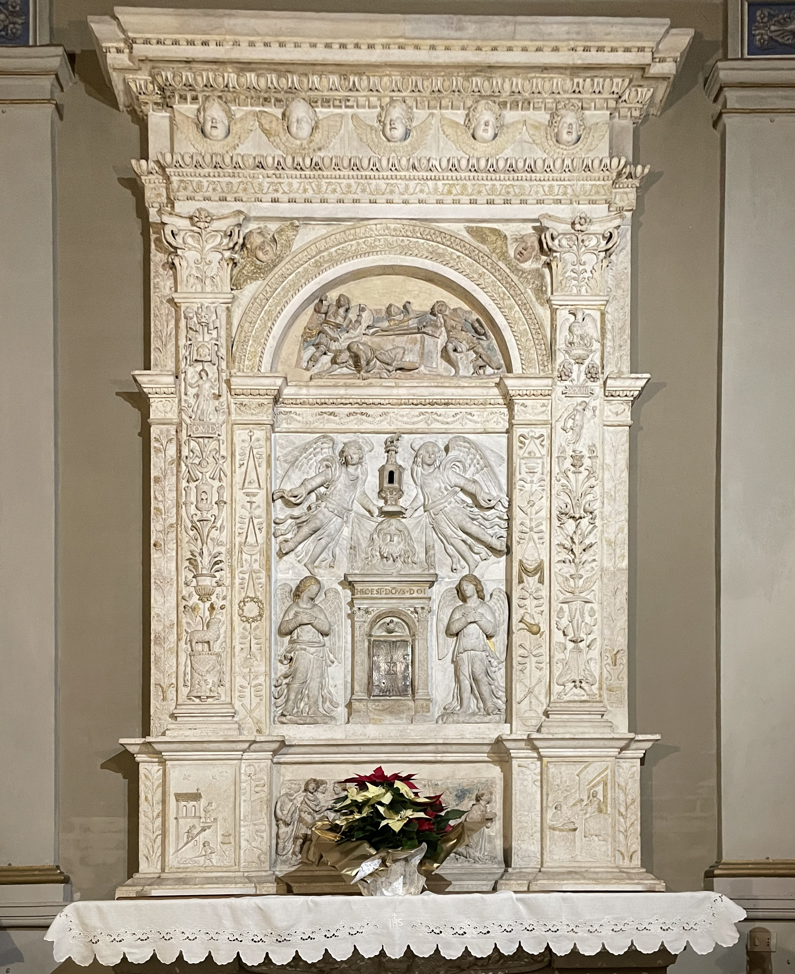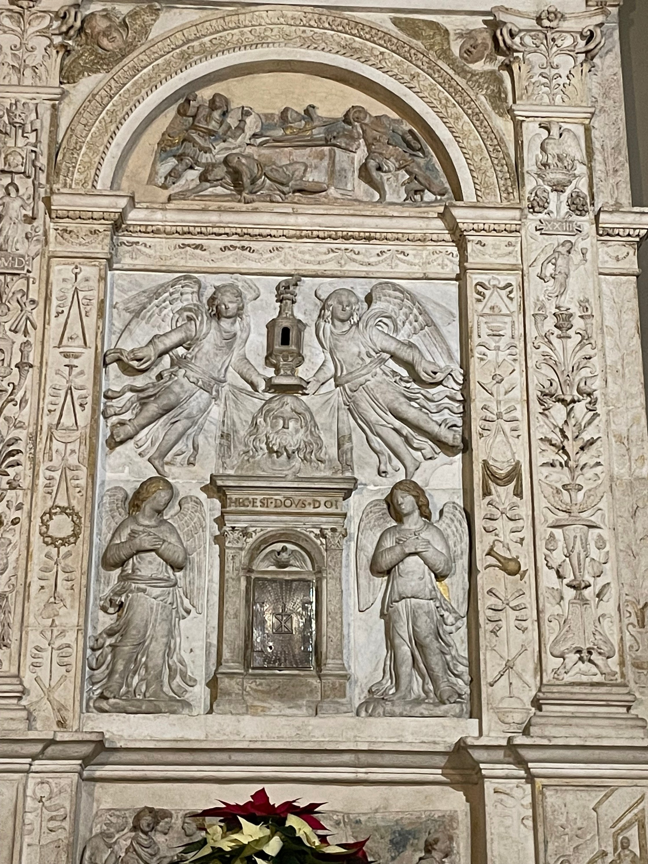 Benedetto Grazzini Da Rovezzano (attribuito), Velo della Veronica sostenuto da angeli, part., Tabernacolo a frontale architettonico, tabernacolo, rilievo in marmo bianco, 1523, Monastero di Santa Maria della Stella, Spoleto (Pg), Italia. Basilica San Gregorio Maggiore, cappella del Sacramento.