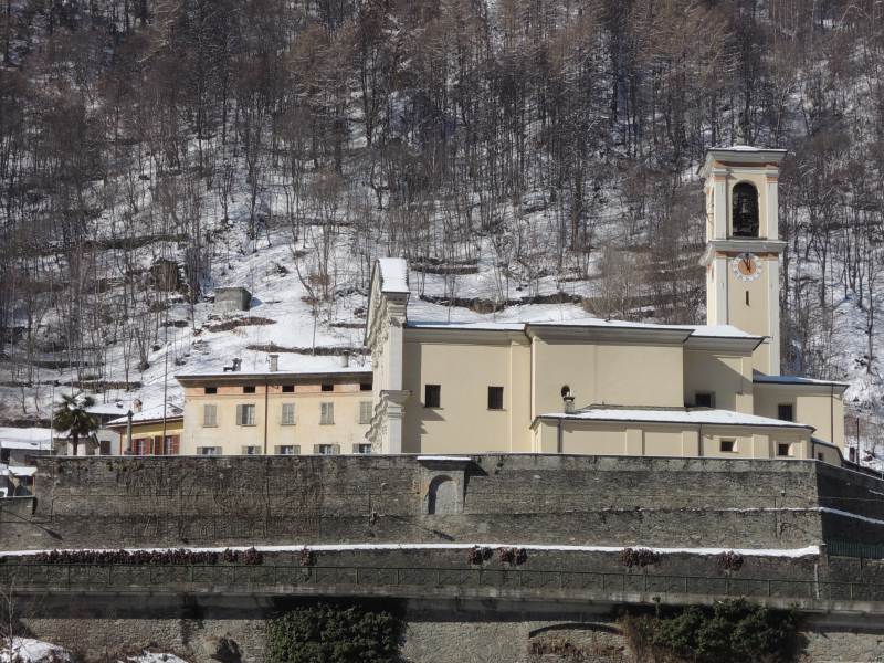 La chiesa, quasi del tutto ricostruita nel 1620 e allungata nel 1919, sorge su un vasto terrapieno e ha davanti un bel piazzale in posizione dominante sulla vallata.