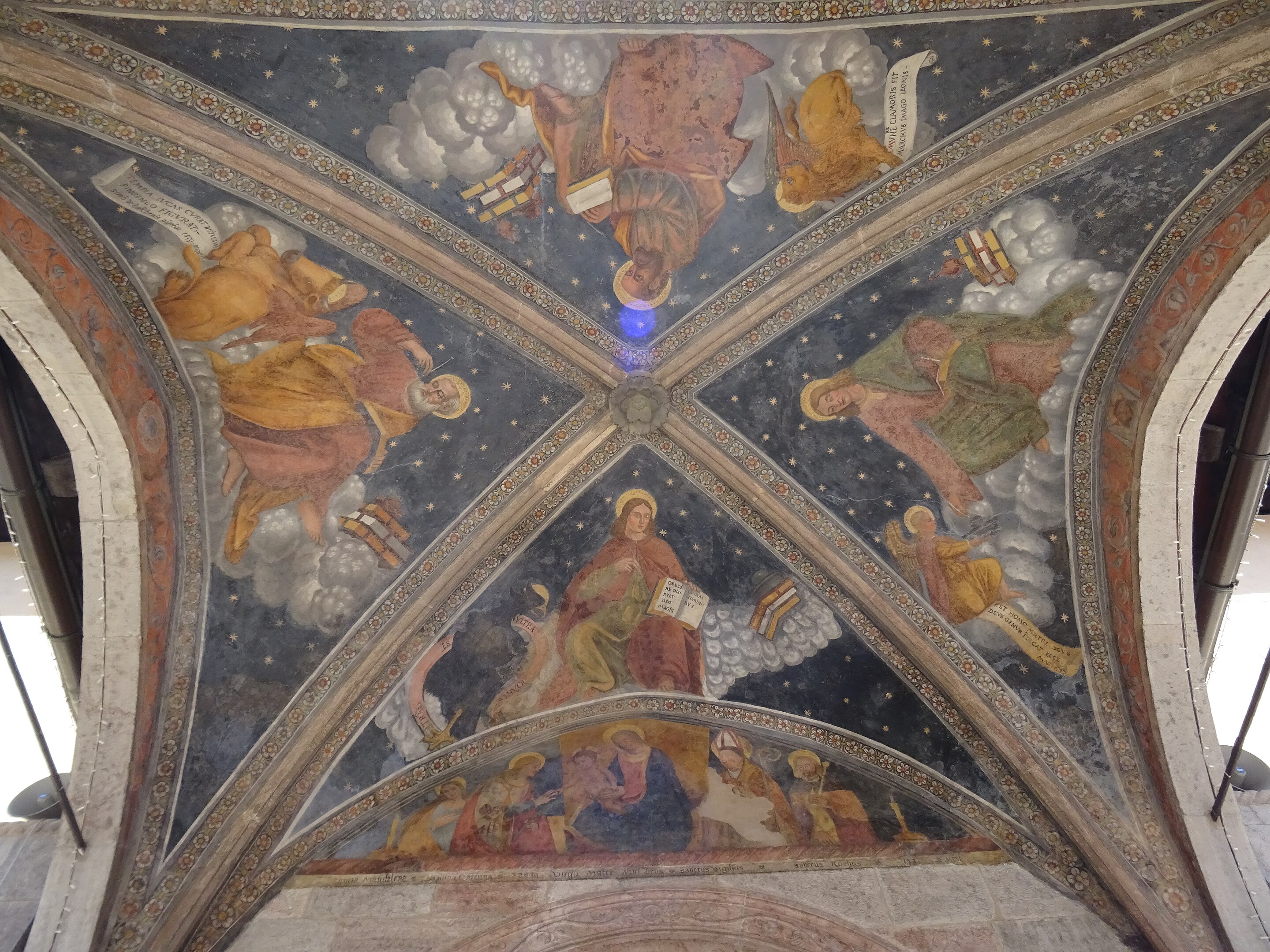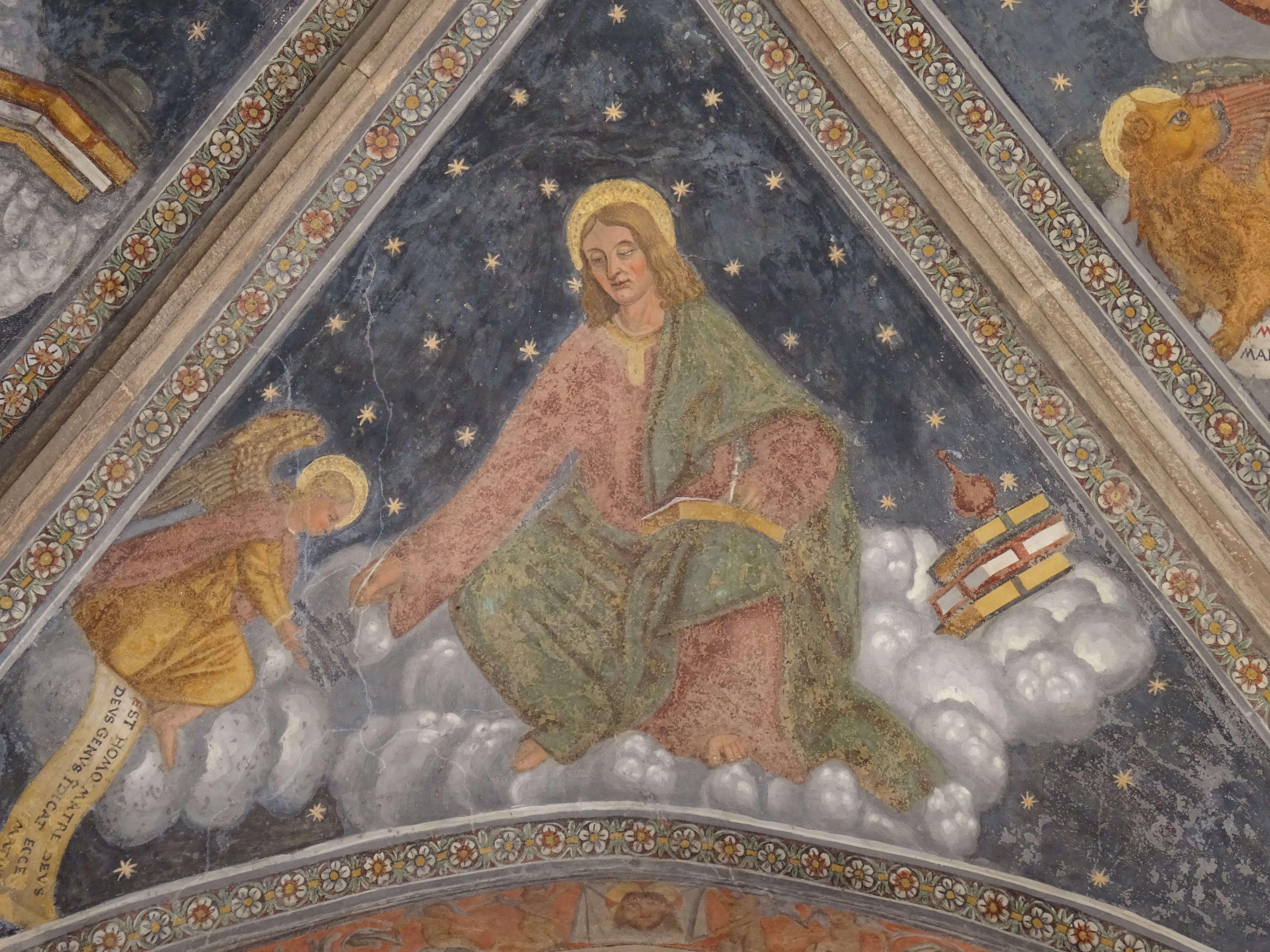 Simone Baschenis, Velo della Veronica, sottarco, affresco, 1533, protiro, Chiesa della Nativitร di Maria, Pellizzano (Tn), Italia.