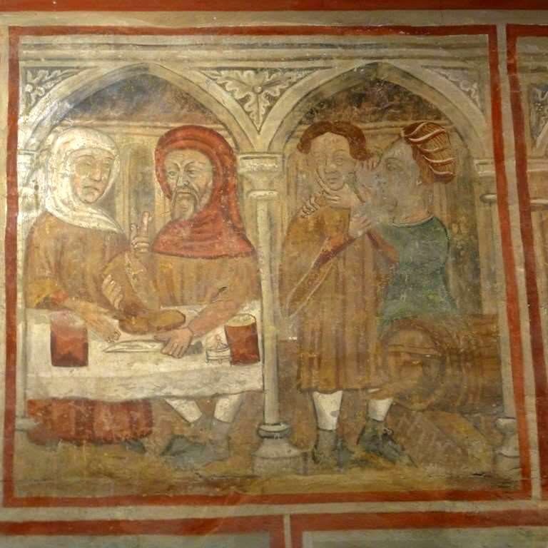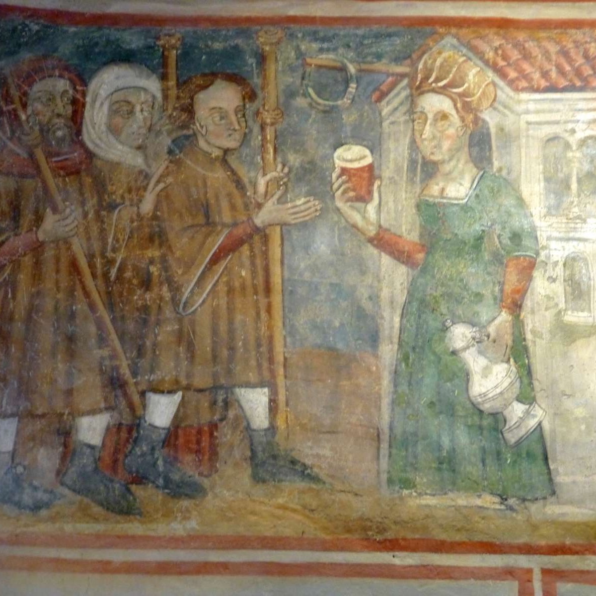 Nella cappella, il richiamo ai pellegrini ritorna sulla parete opposta con la storia suddivisa in nove riquadri del Miracolo “del pellegrino impiccato” di San Giacomo. Narra la leggenda che un giovane pellegrino, ingiustamente accusato da un oste di furto, venne per questo impiccato. Purtroppo l’ordine inferiore del “fumetto” è rovinato, ma sappiamo dalla leggenda che il giovane non morì perché san Giacomo lo sostenne fino al ritorno dei genitori. Il racconto termina con la “risurrezione” di due polli allo spiedo, che cantando accuseranno l’oste consegnandolo alla giustizia. Il racconto di questo miracolo – tra i più rappresentati del ciclo di San Giacomo – aveva forse lo scopo di mettere in guardia i pellegrini dagli albergatori senza scrupoli. Nel paese sottostante di La Bessée era a quei tempi famosa una locanda per le sospette sparizioni dei viaggiatori che vi soggiornavano.