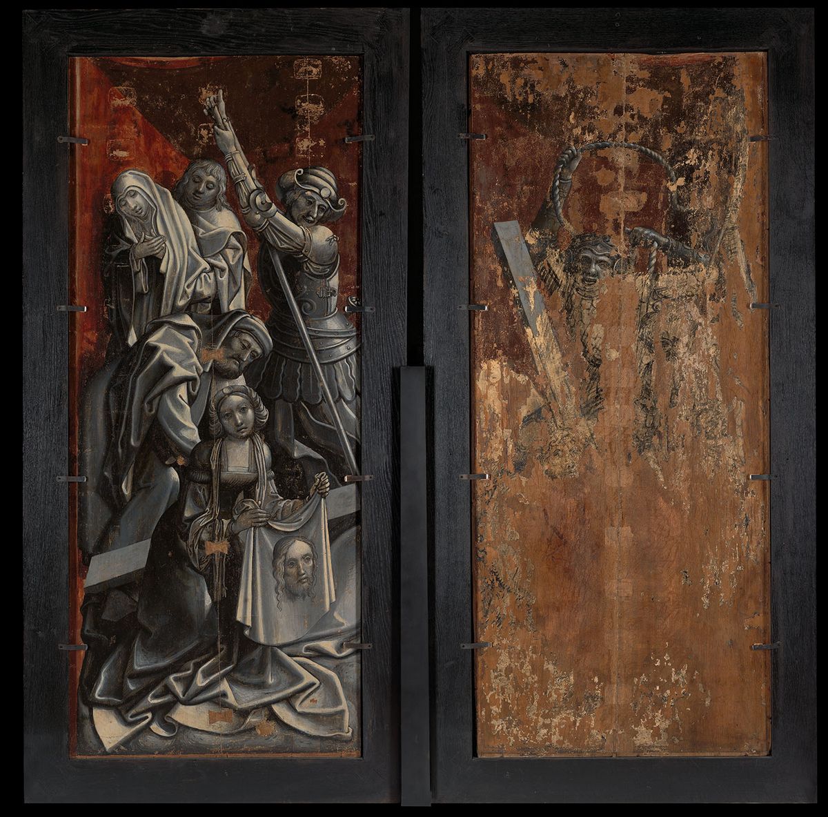 Il Cristo portacroce con Simone di Cirene, Maria, Giovanni e Santa Veronica con il sudario, diviso sui due pannelli, realizzato a grisaille, era visibile quando l’altare era chiuso, di norma nel periodo quaresimale. All’interno le ante presentano scene della vita e del martirio di santa Caterina e san Clemente. Non è noto il soggetto della pala centrale.