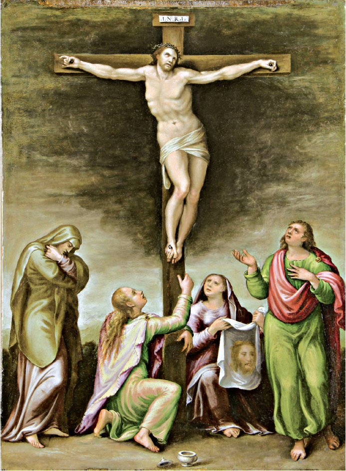 Fermo Ghisoni (attribuito), Crocifissione con santi, olio su tavola, 1545-1555 ca., Mantova (Mn), Italia. Collezione Creval, Sondrio.