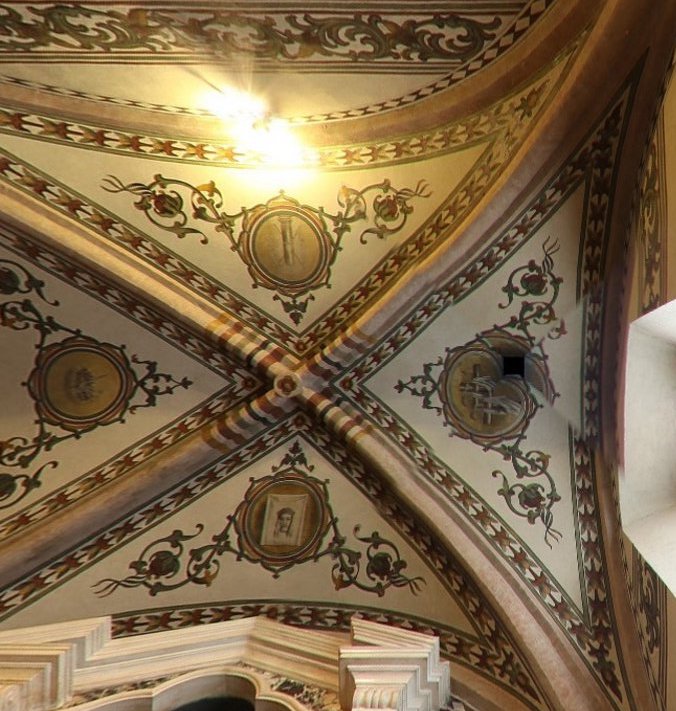Simboli della Passione, volta, affresco, 1500-1599, cappella del Crocifisso, basilica di Santa Anastasia, Verona, Italia.