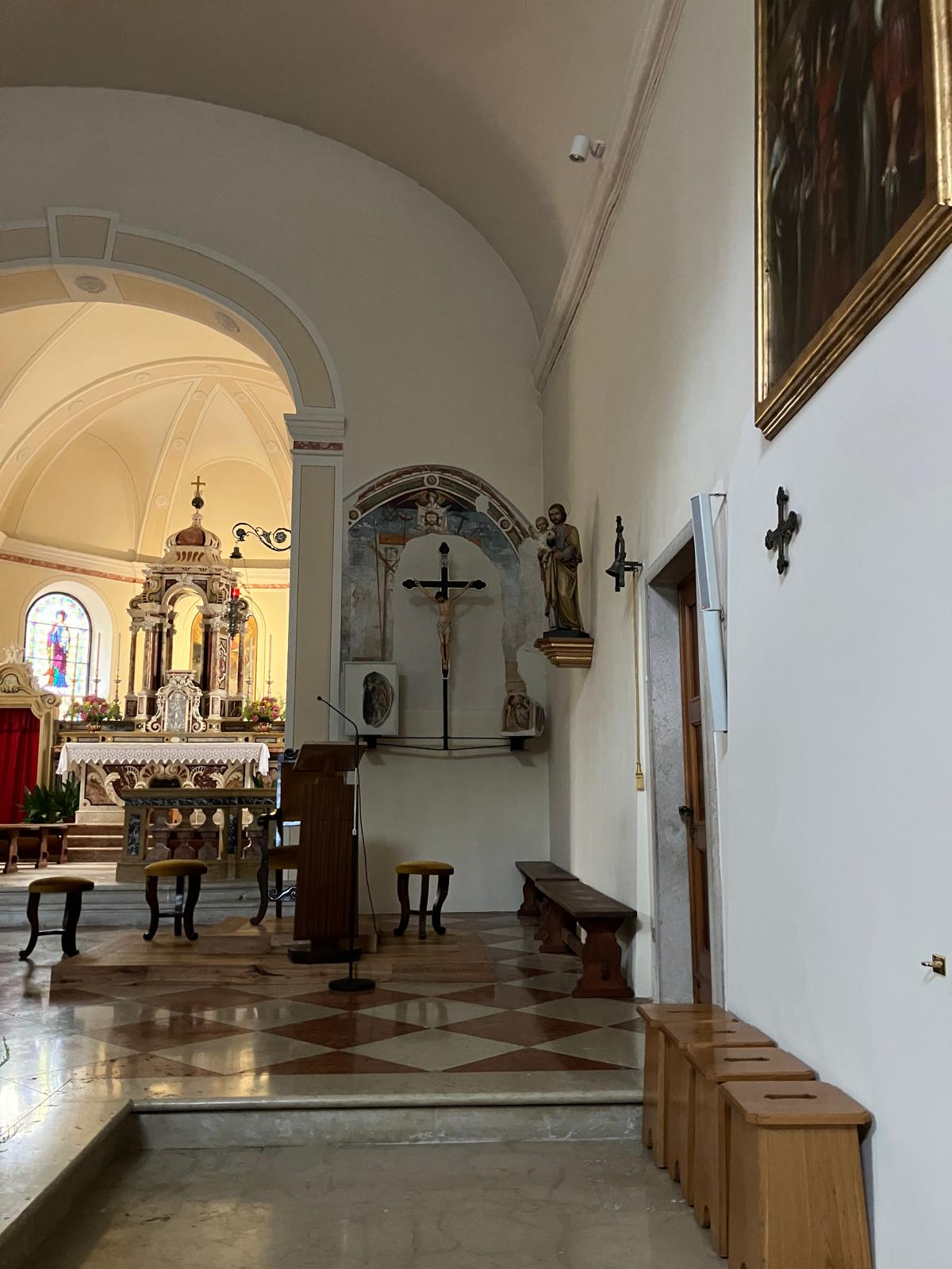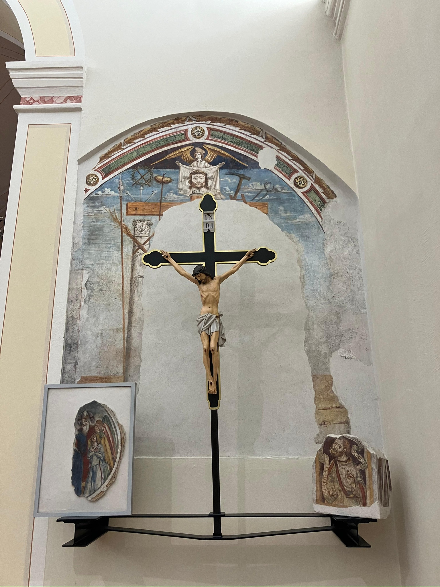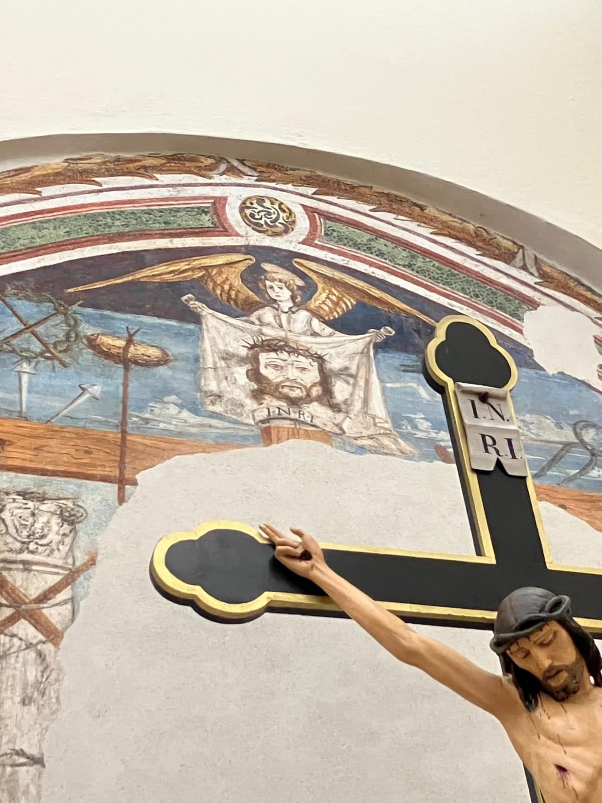 L’Arma Christi, a destra sull’arco di accesso all’abside, è parte degli affreschi dell’originario arco trionfale ed è stata recuperata durante i lavori di ampliamento negli anni ’70 del secolo scorso.