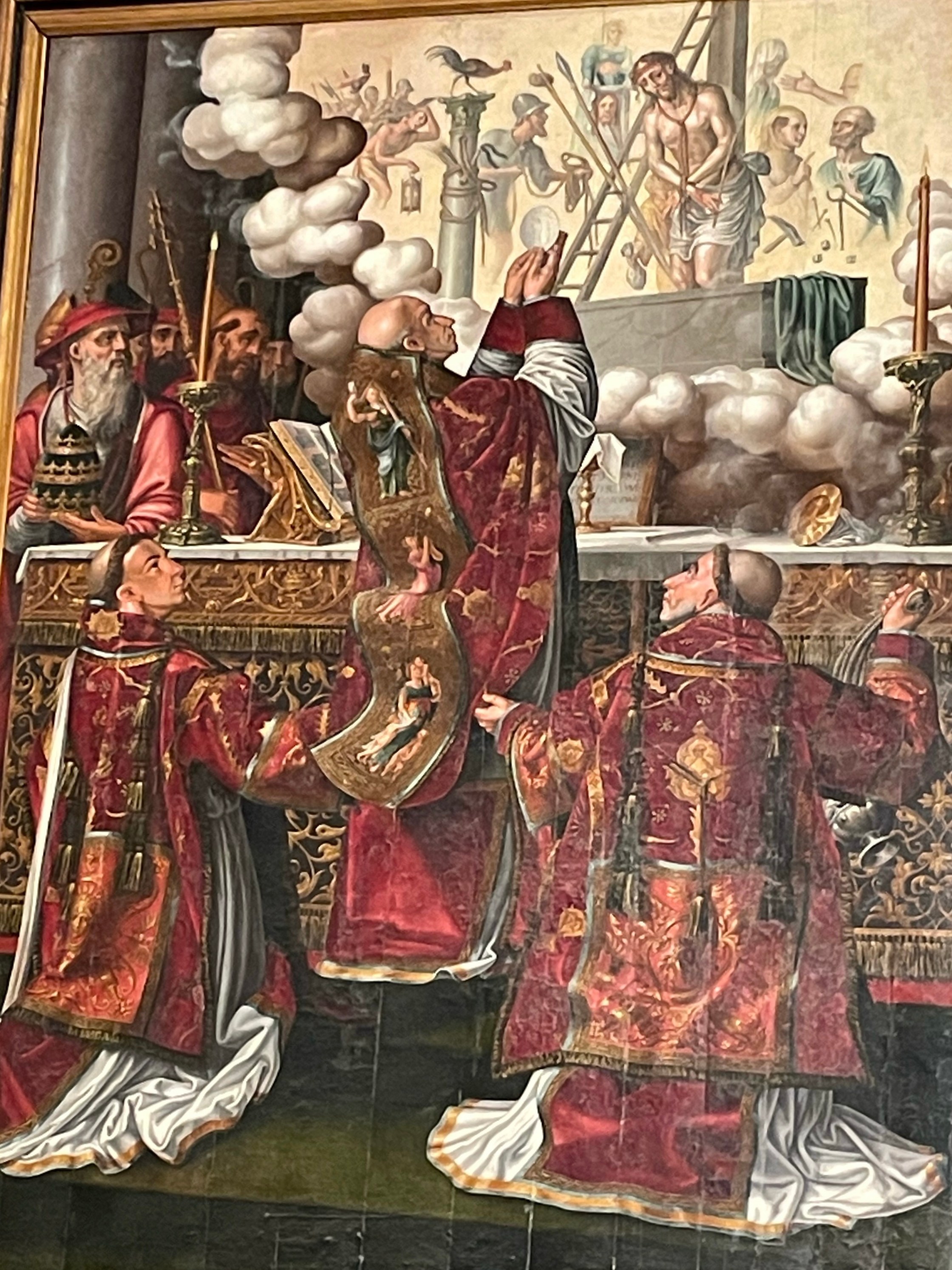 Hernando de Esturmio, Messa di San Gregorio, retablo, 1553-1555, capilla de los Evangelistas, catedral de Santa MarÃa de la Sede, Sevilla, Spagna.