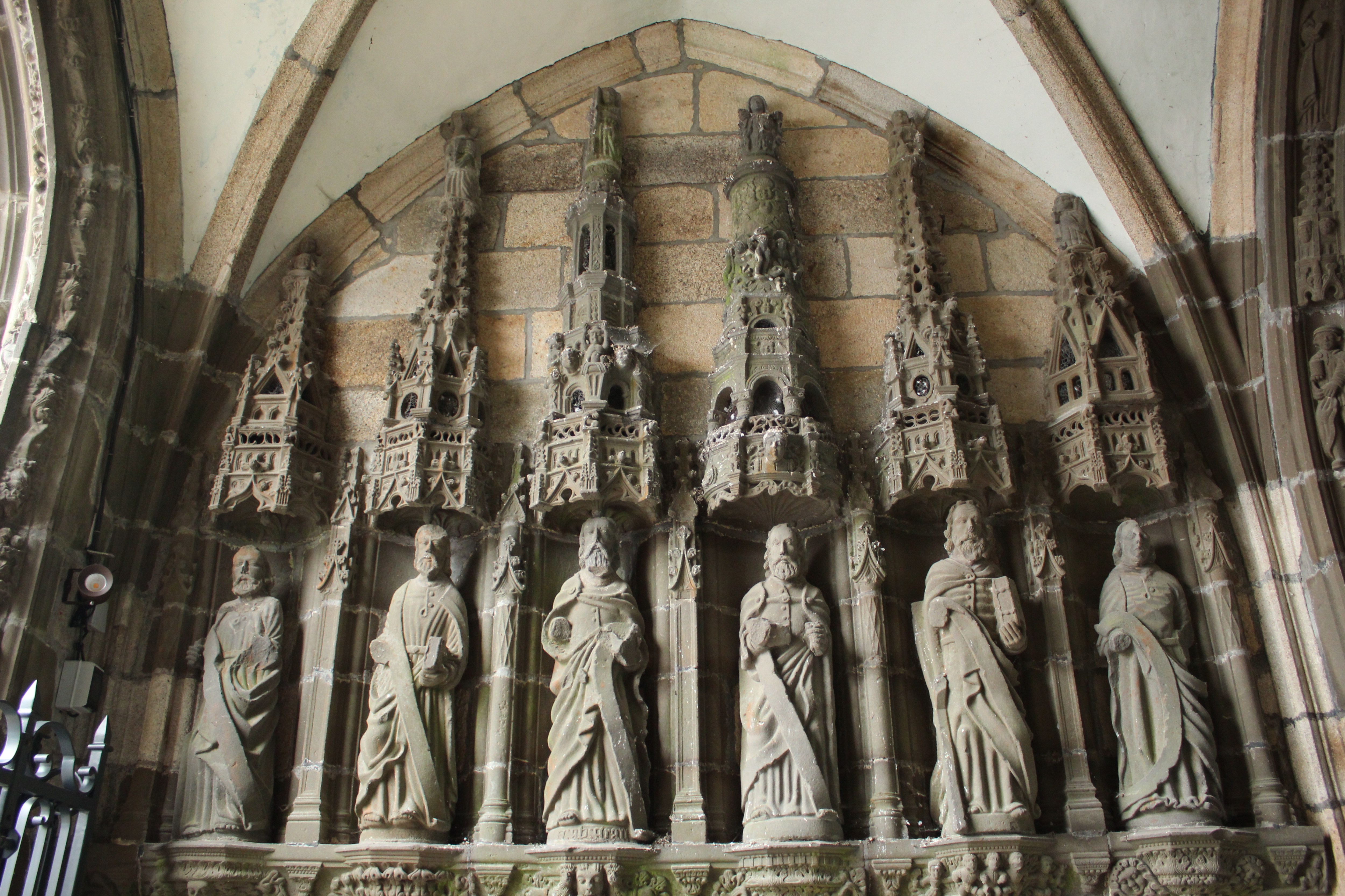 Henry Prigent, Santa Veronica con il velo, scultura, guglie degli apostoli, lato sinistro, 1554-1565, portico, รฉglise de Saint-Thivisiau, Landivisiau, Francia.