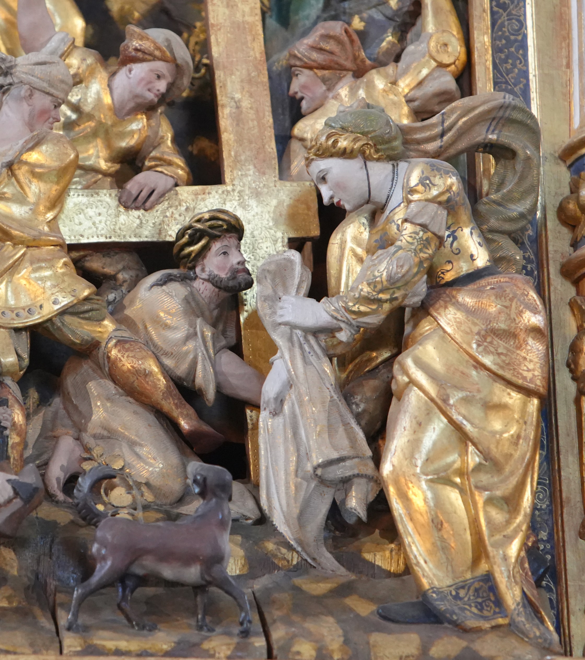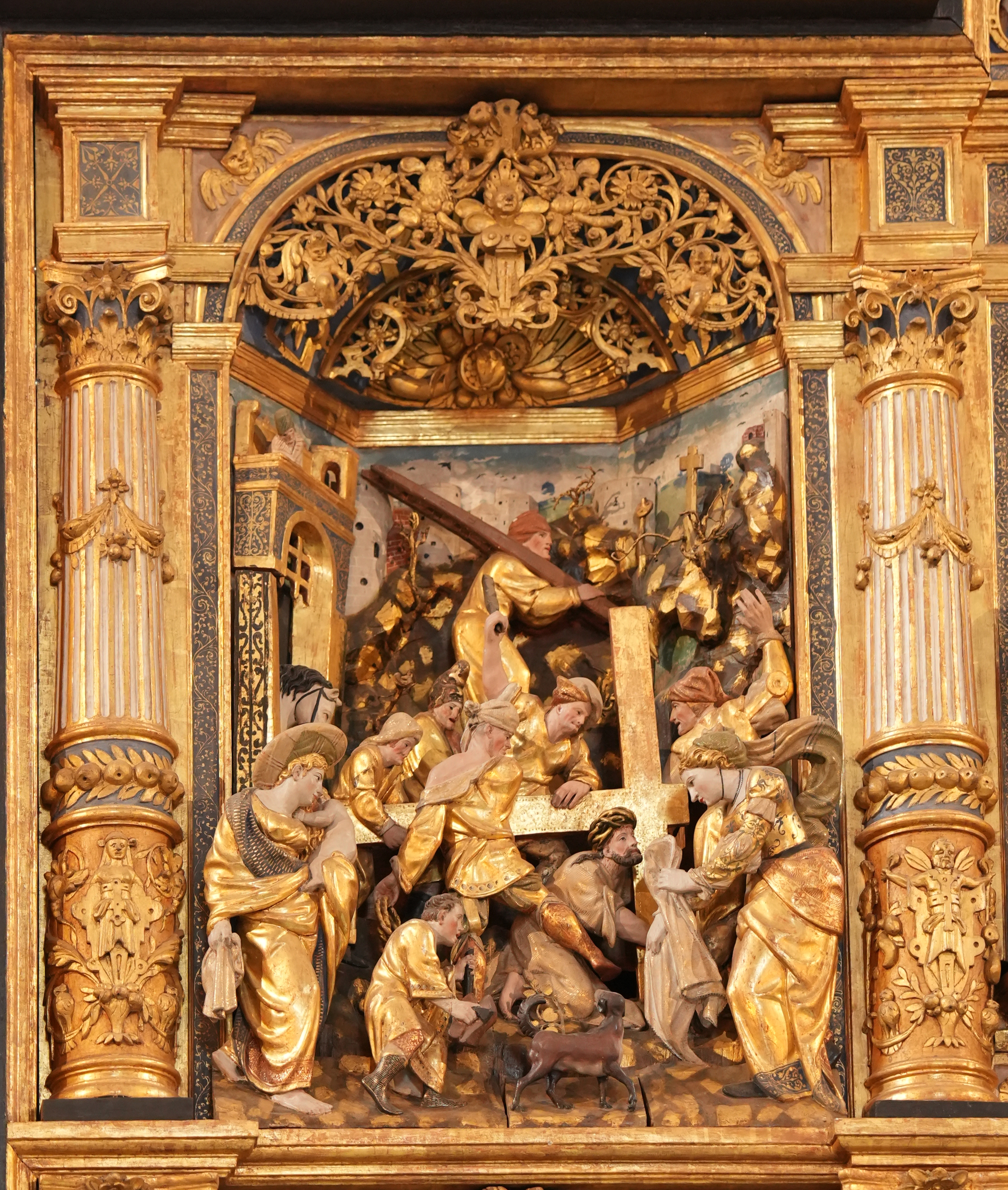 Scuola di Anversa, Salita al Calvario, part., Crocifissione e storie della vita di Cristo, pala d'altare, rilevo in legno policromo e dorato, 1558-1623, Altare maggiore, Roskilde Domkirke, Roskilde, Danimarca.
