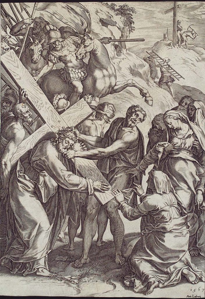 Girolamo Maurizio, Cornelis Cort, Salita al Calvario e incontro con la Veronica, incisione, rame, 1567, Roma, Italia. Herzog August Bibliothek Wolfenbüttel.