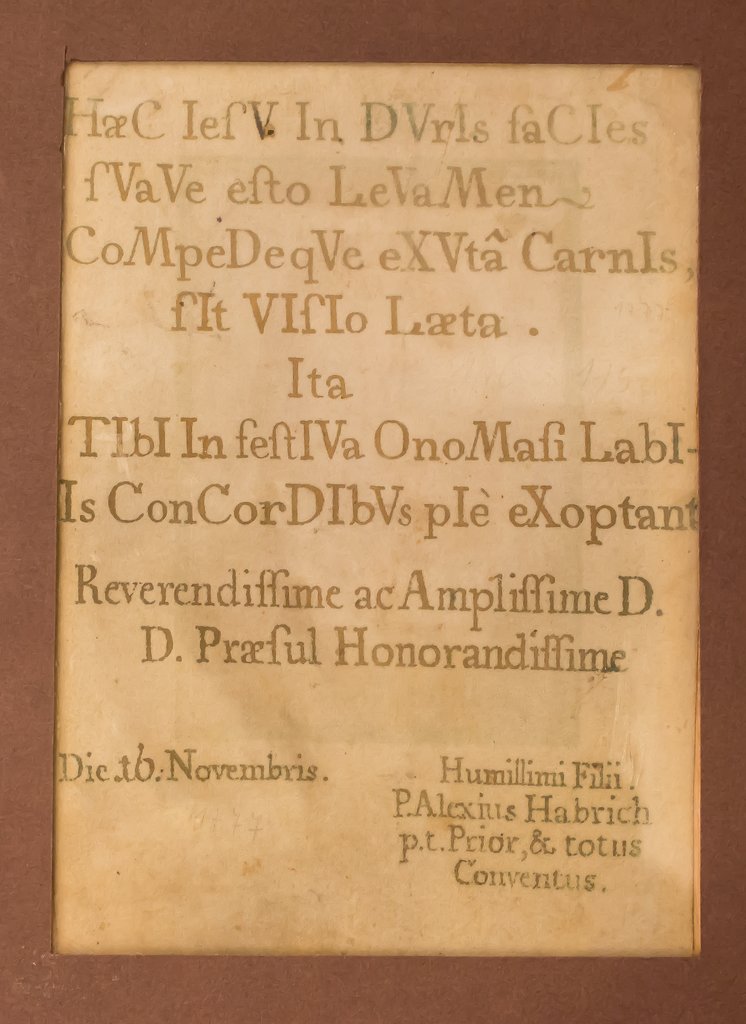 Sul retro la dedica indica un onomastico come occasione dell’omaggio da parte del priore, padre Alexius Habrich, e di tutto il convento. L’augurio è: Questo volto di Gesù sia sollievo nelle avversità e, dopo la vita mortale, sia lieta visione.