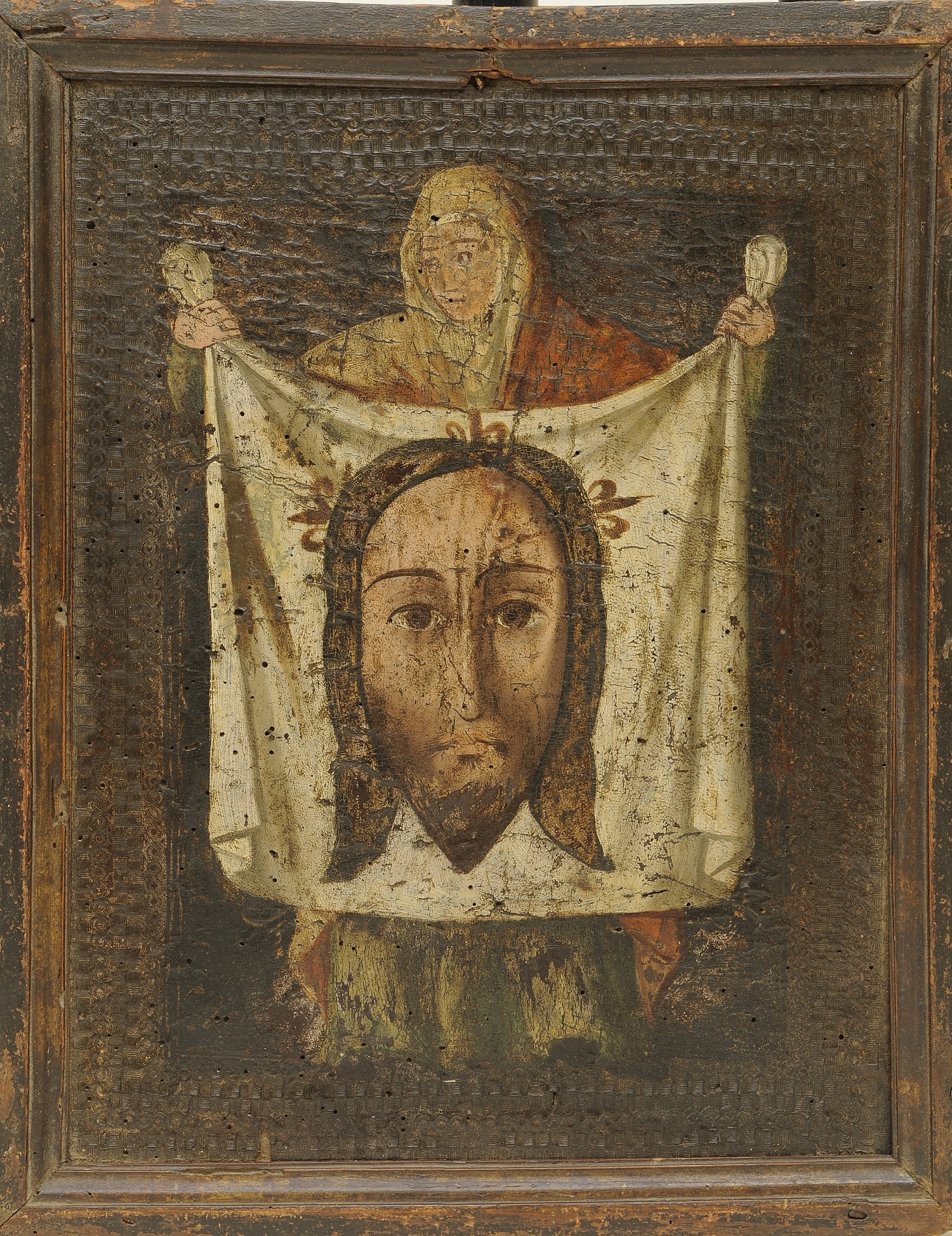Santa Veronica con il velo, olio su cuoio, guadamecí, 1550-1596, Spagna. Museo della Sindone, Torino.