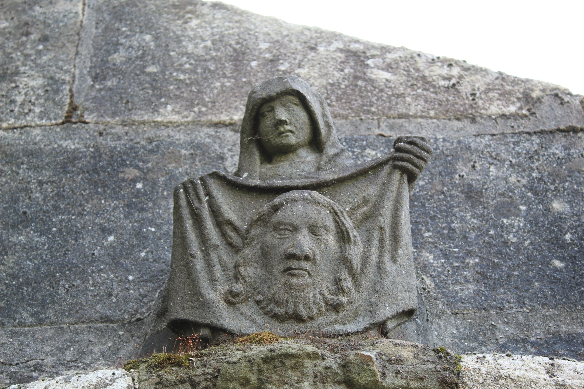 Santa Veronica con il velo, scultura in pietra, 1550-1590, portale nord, eglise paroissiale Saint-Pierre, Plonévez-du-Faou, Francia.