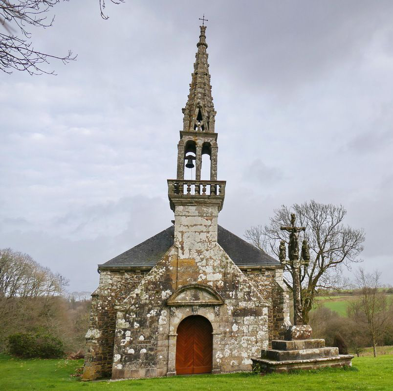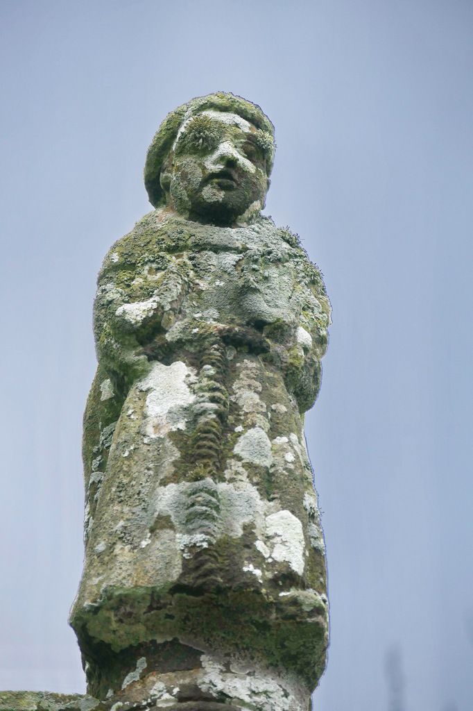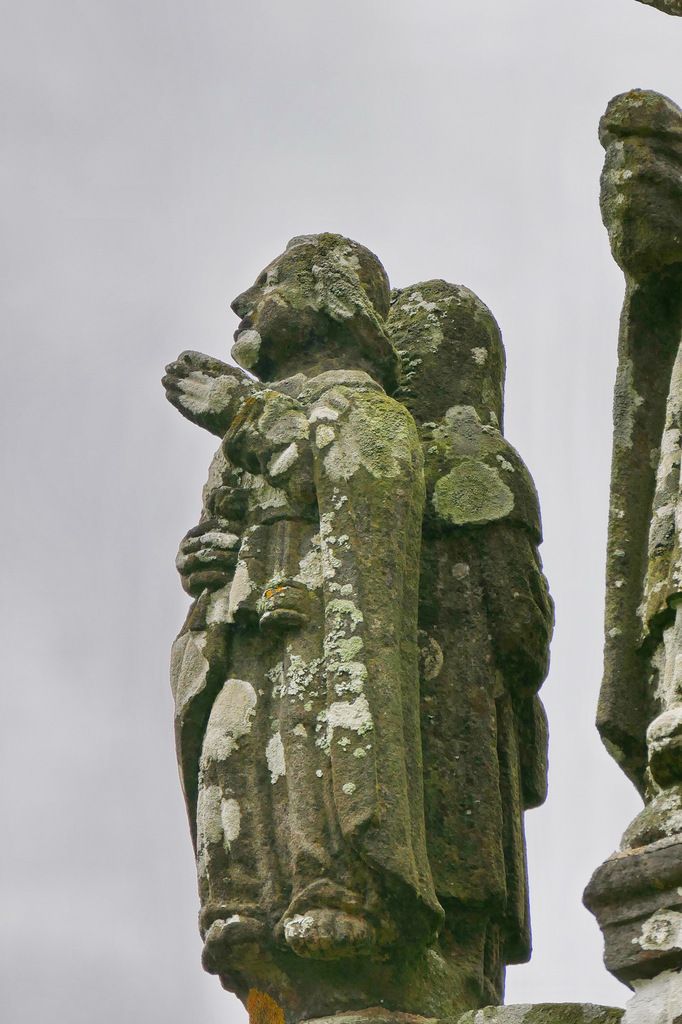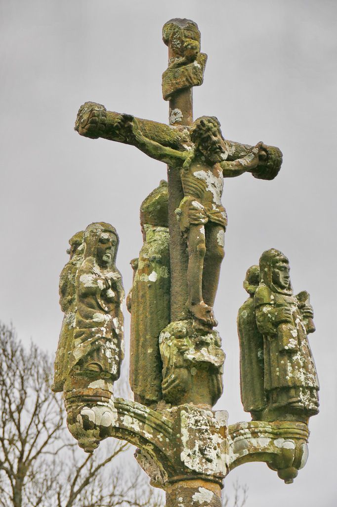 Il Calvario è orientato secondo tradizione con il Crocifisso rivolto a occidente. La traversa reca le statue geminate della Vergine e di Francesco d’Assisi e di Sant’Ives e San Giovanni. Per un errore che non è stato corretto durante l’ultimo restauro, le statue geminate di Giovanni e Sant’Ivo sono state girate, così Giovanni è sul lato del vescovo e guarda verso il cielo. Al centro, sotto il crocifisso, due angeli che raccolgono il sangue nel calice e il sudario della Veronica. Sul lato est, Saint Exupère sopra uno scudo. Alla base della colonna san Matteo evangelista.