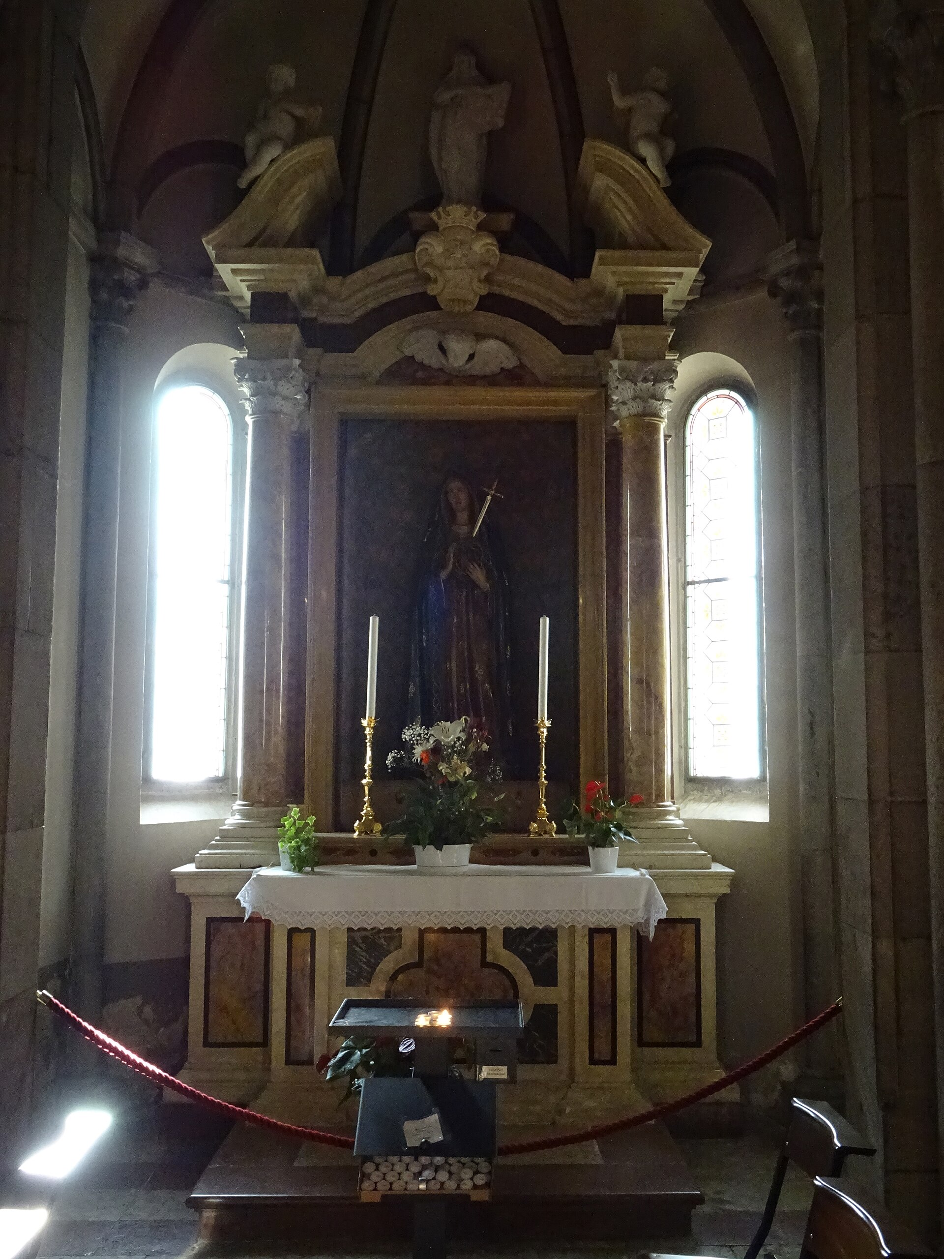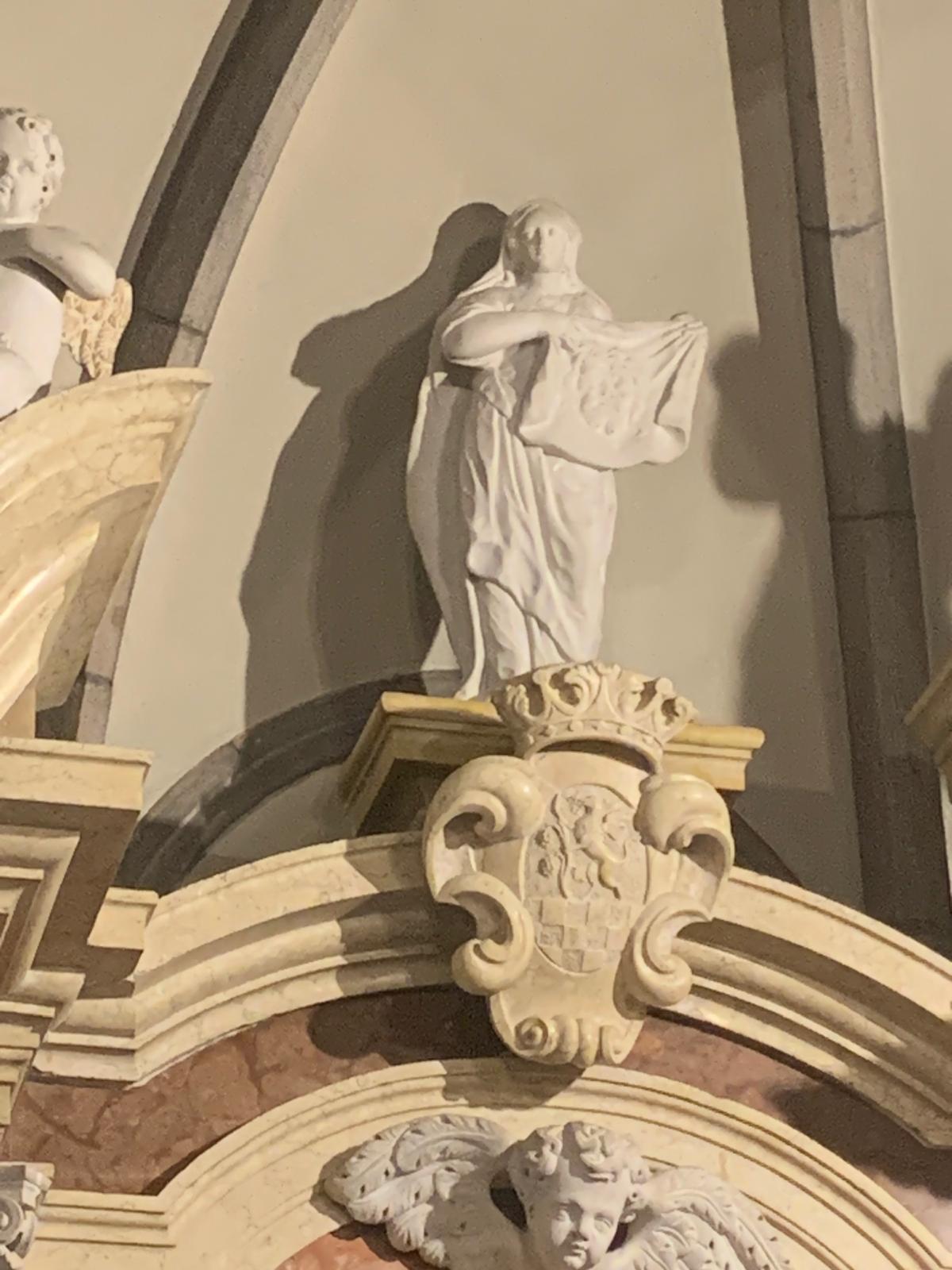 Santa Veronica con il velo, cimasa, 1600 ca., cappella dell'Addolorata, chiesa di Santa Maria Assunta, Malé (Tn), Italia.