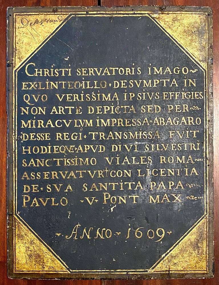 CHRISTI SERVATORIS IMAGO-EX.LINTEO.ILLO.DESUMPTA IN QUO VERISSIMA IPSIUSEFFIGIES NON ARTE DEPICTA SED PER – MIRACULUM IMPRESSA.ABAGARO DESSE REGI.TRANMISSA FUIT HODIEQUE.APUD DIVI SILVESTRI SANCTISSIMO VIALES ROMA – ASSERVATUR†CON LICENTIA DE . SVA SANTITA PAPA – PAVLO .V. PONT MAX -/ ANNO. 1609.