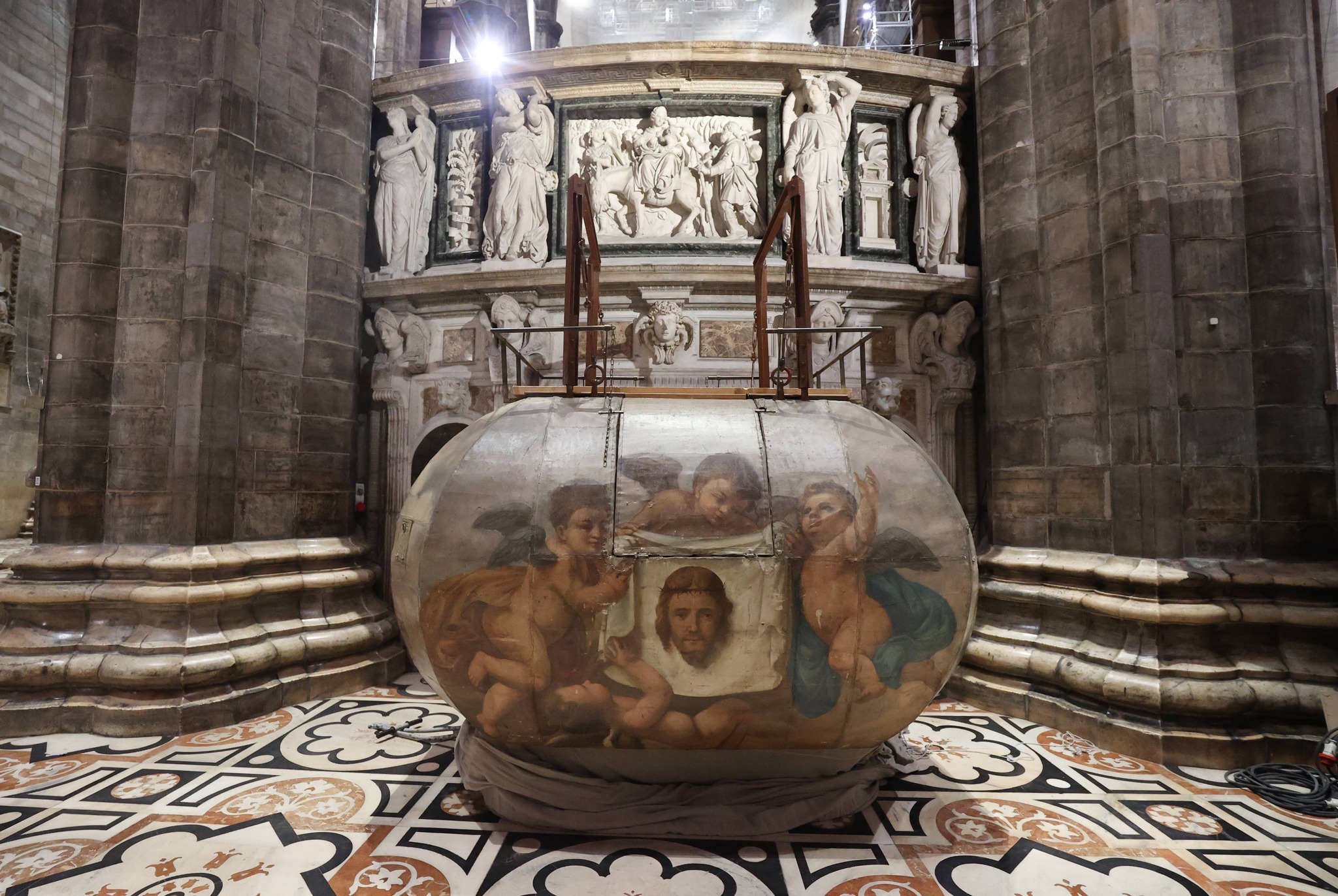 Paolo Camillo Landriani, Velo della Veronica sostenuto da angeli, part., Nivola, pittura, cartapesta, 1612, Duomo di Santa Maria Nascente, Milano, Italia.